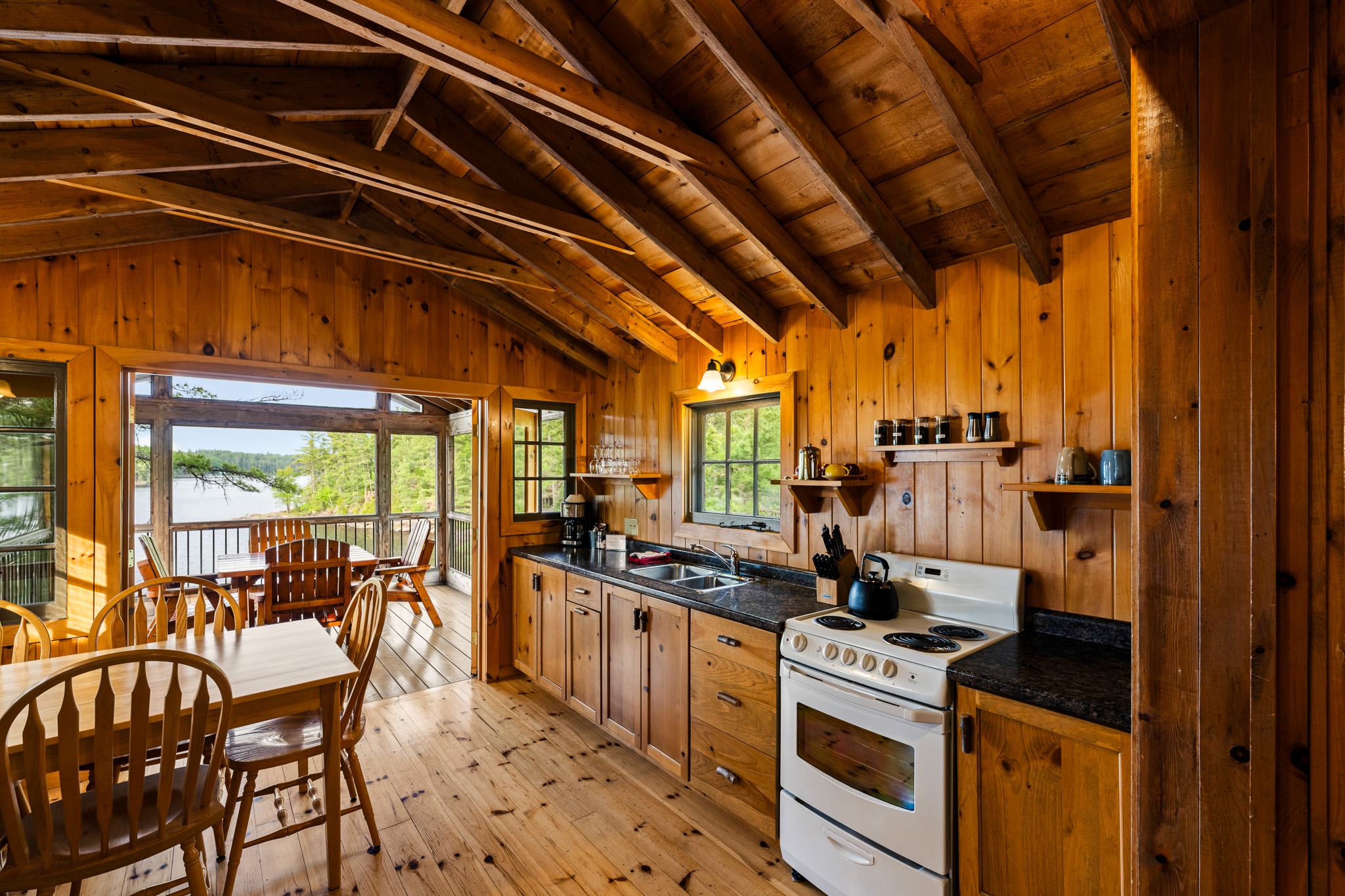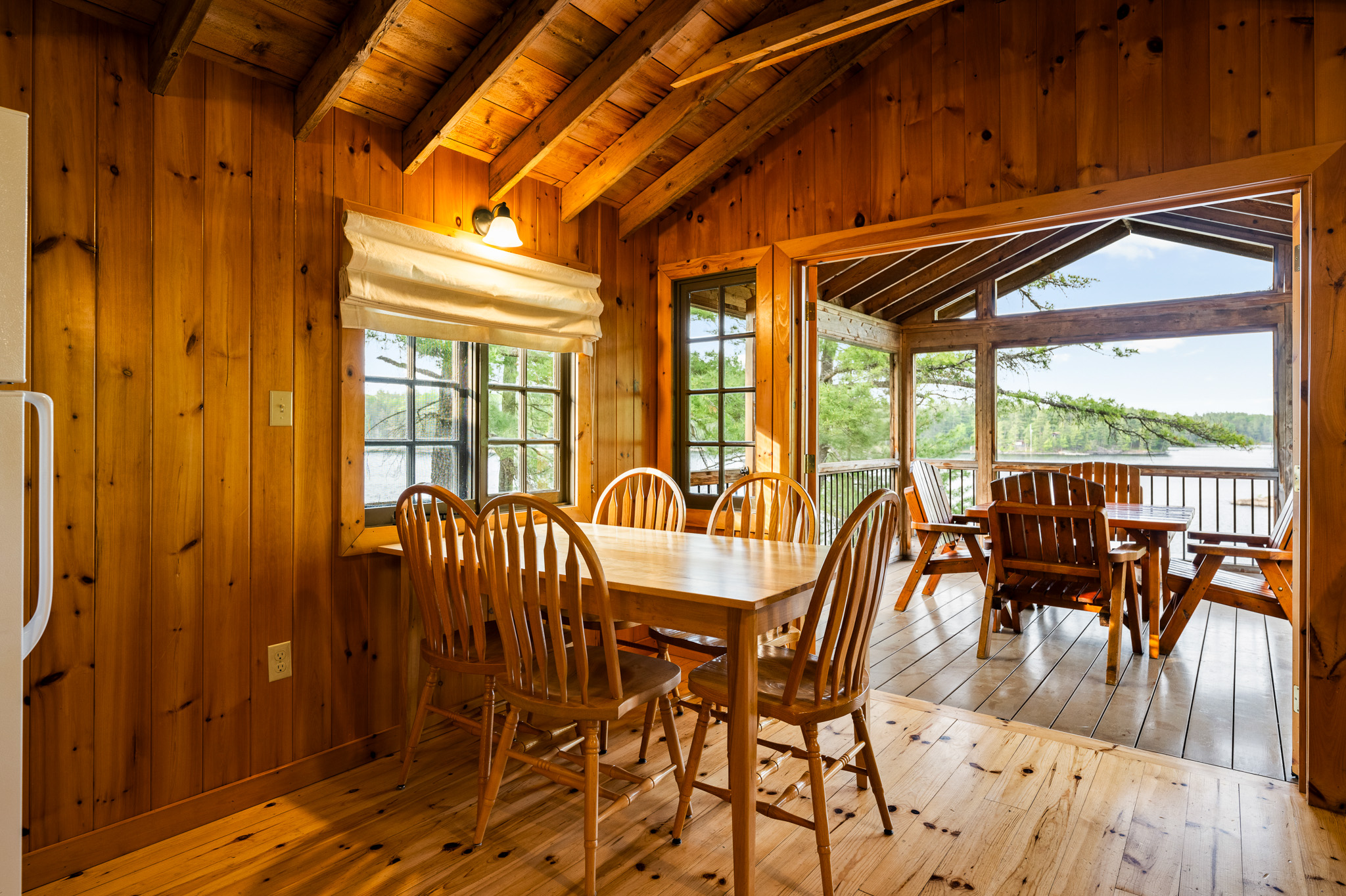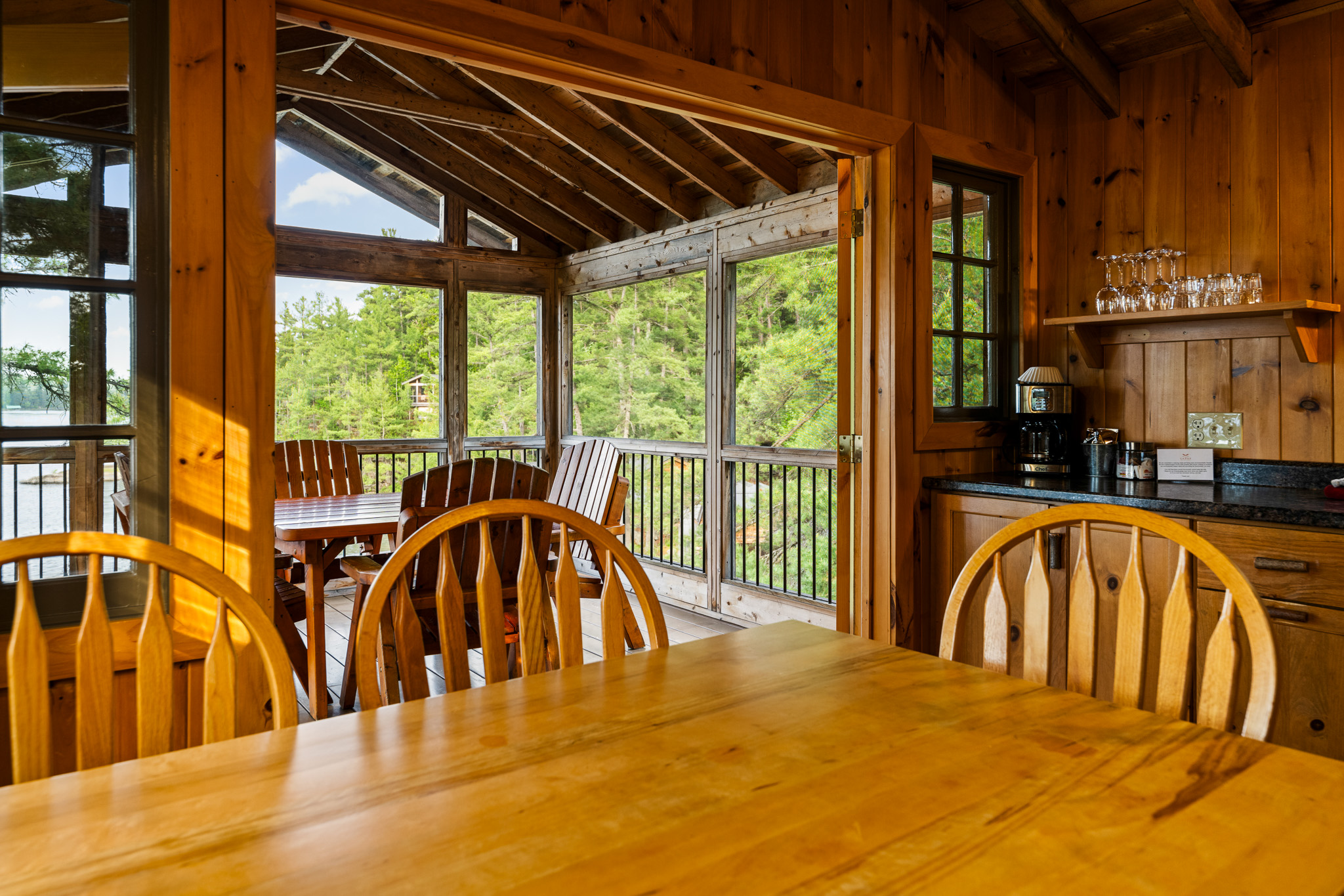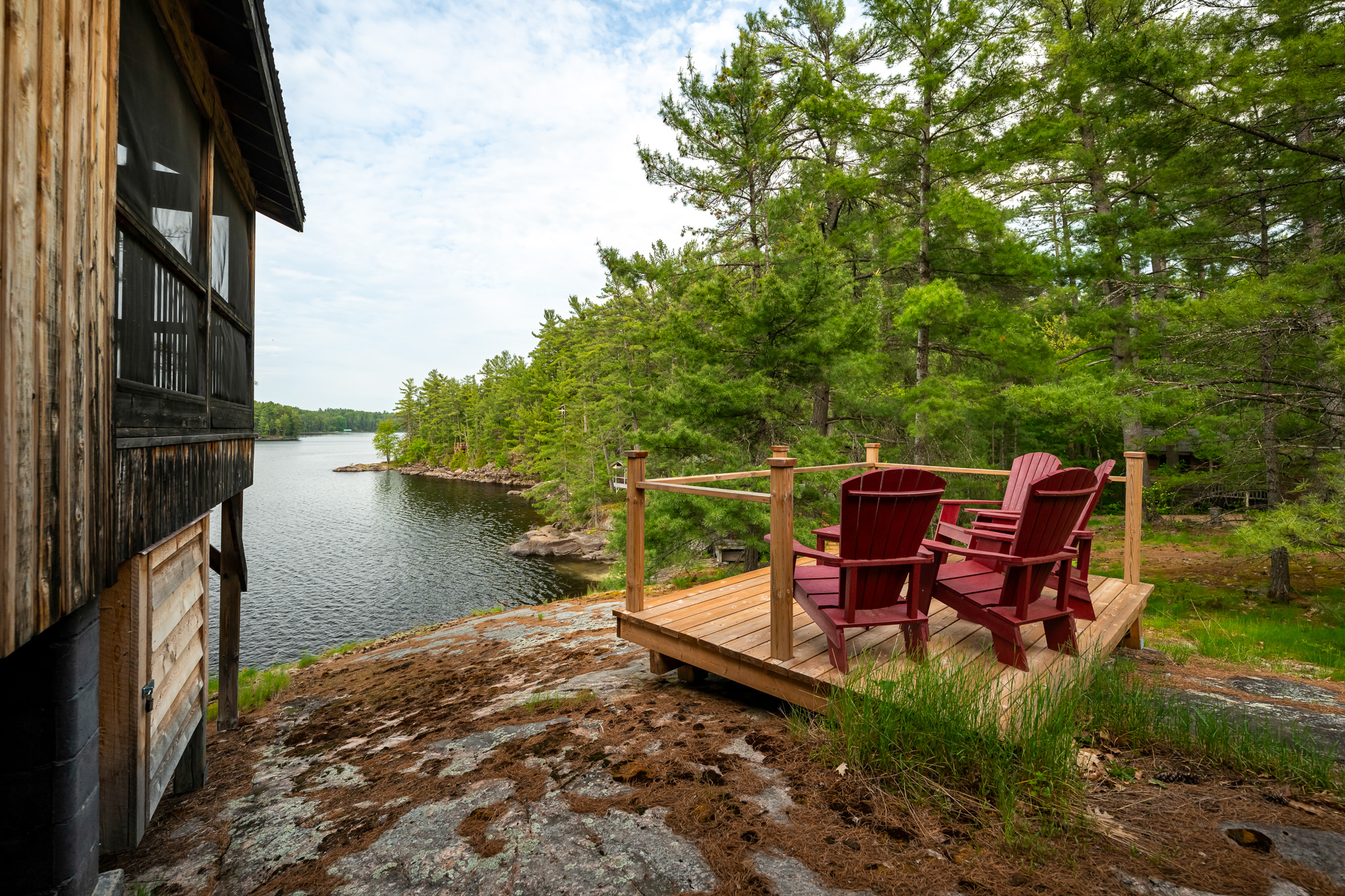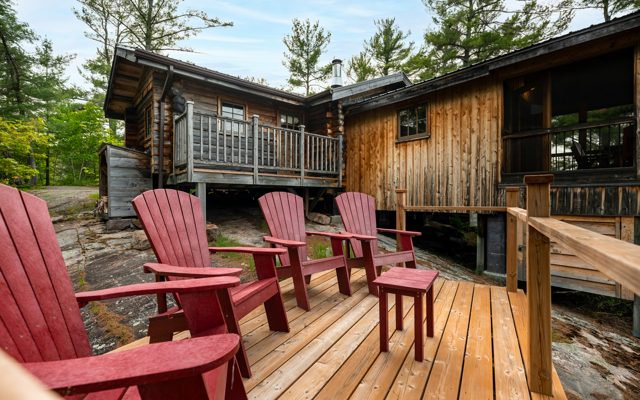 Lodge at Pine Cove’s only log cabin. Named after an Ojibwa chief of the mid 1800s. Norman Dokis Jr. his great-great-grandson, built the cottage for us. Dokis is sited on a smooth granite slope, with really wonderful views of the water. Spacious inside with more than enough room for four guests. Dokis has a large living room, dining area and kitchen. French doors open onto a large screened porch. It also has a back porch were reading a book in the early morning sun is a real treat. The cottage has a feel to it that takes one far back in the tradition of early Canadian log cabins but with all the modern amenities – luxury rustic chic at its best.
