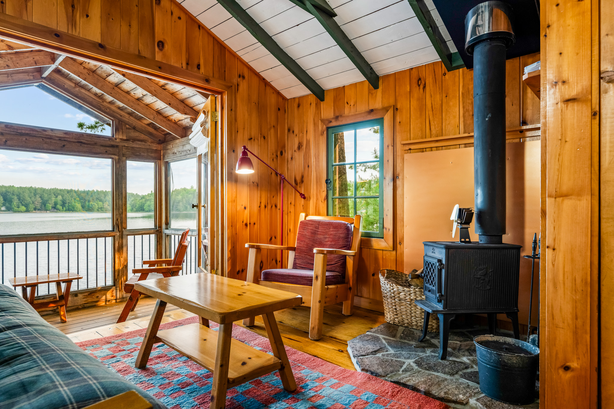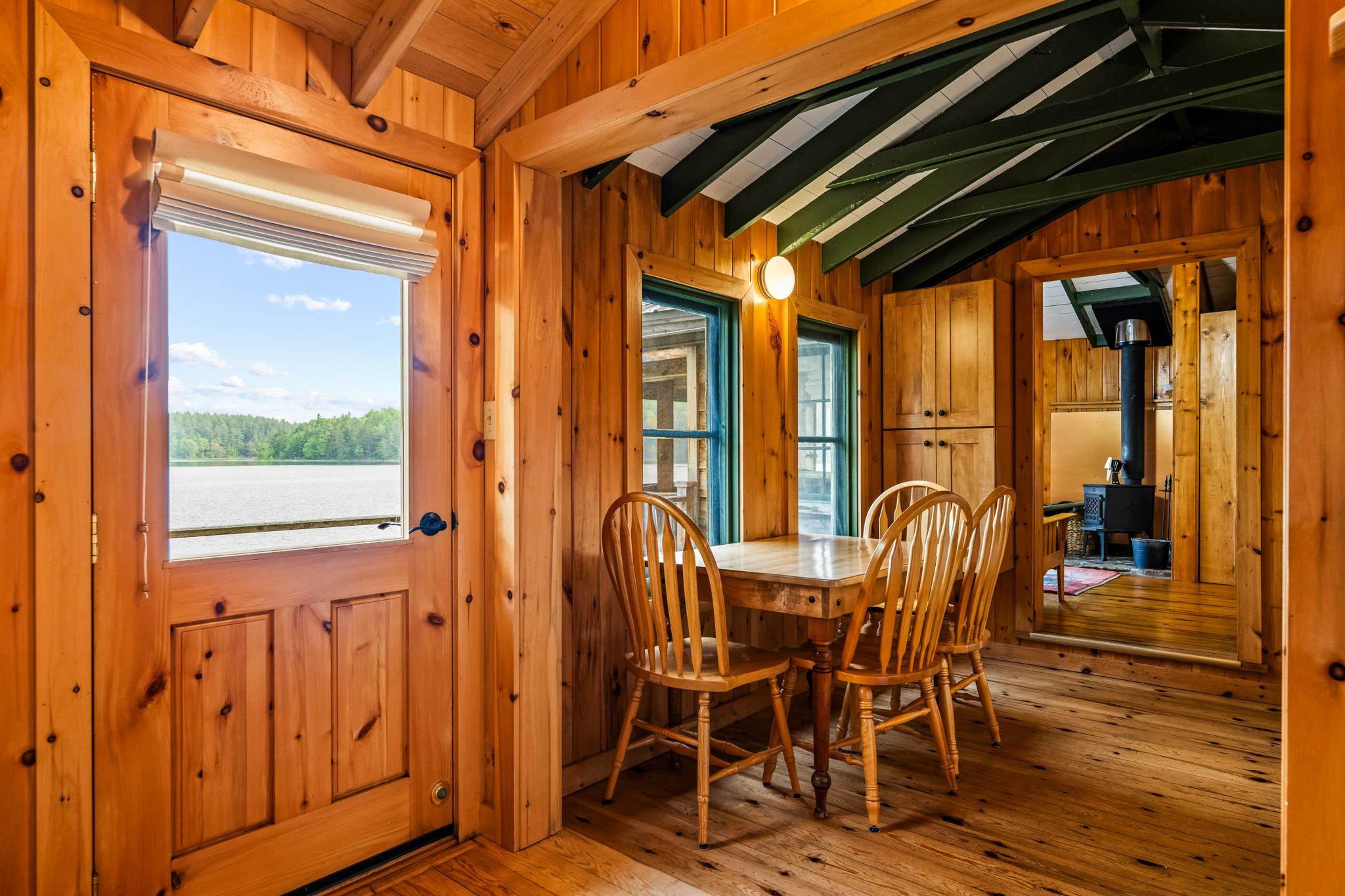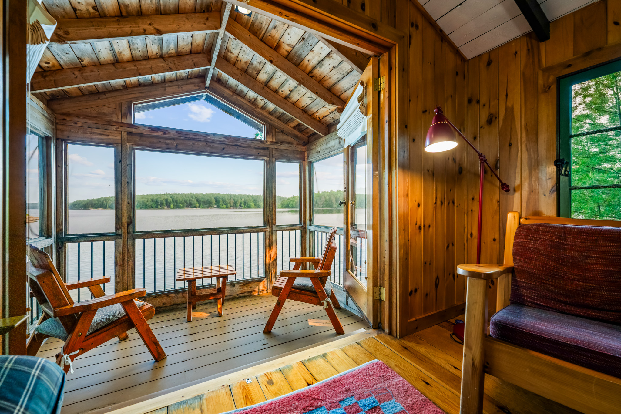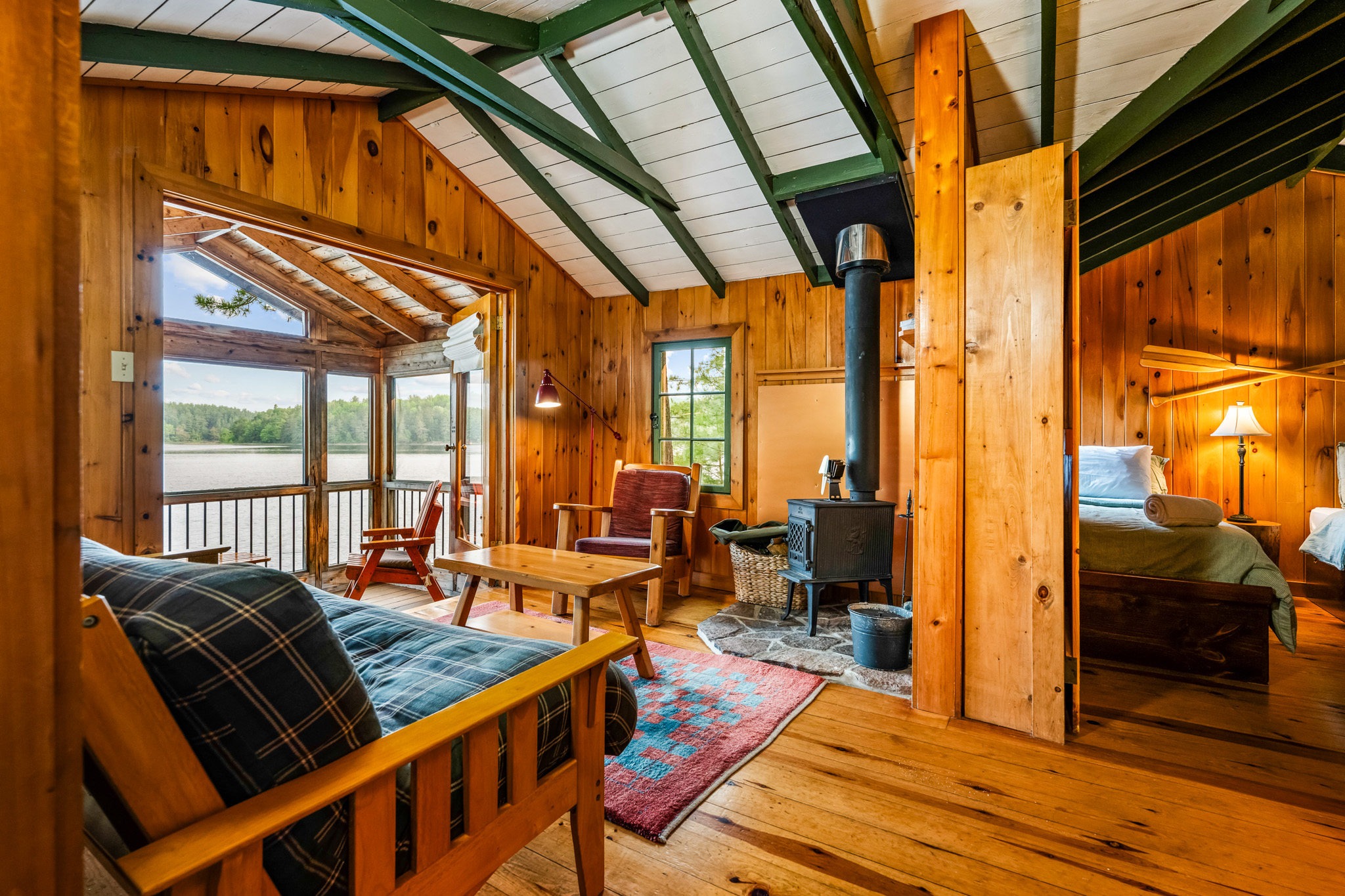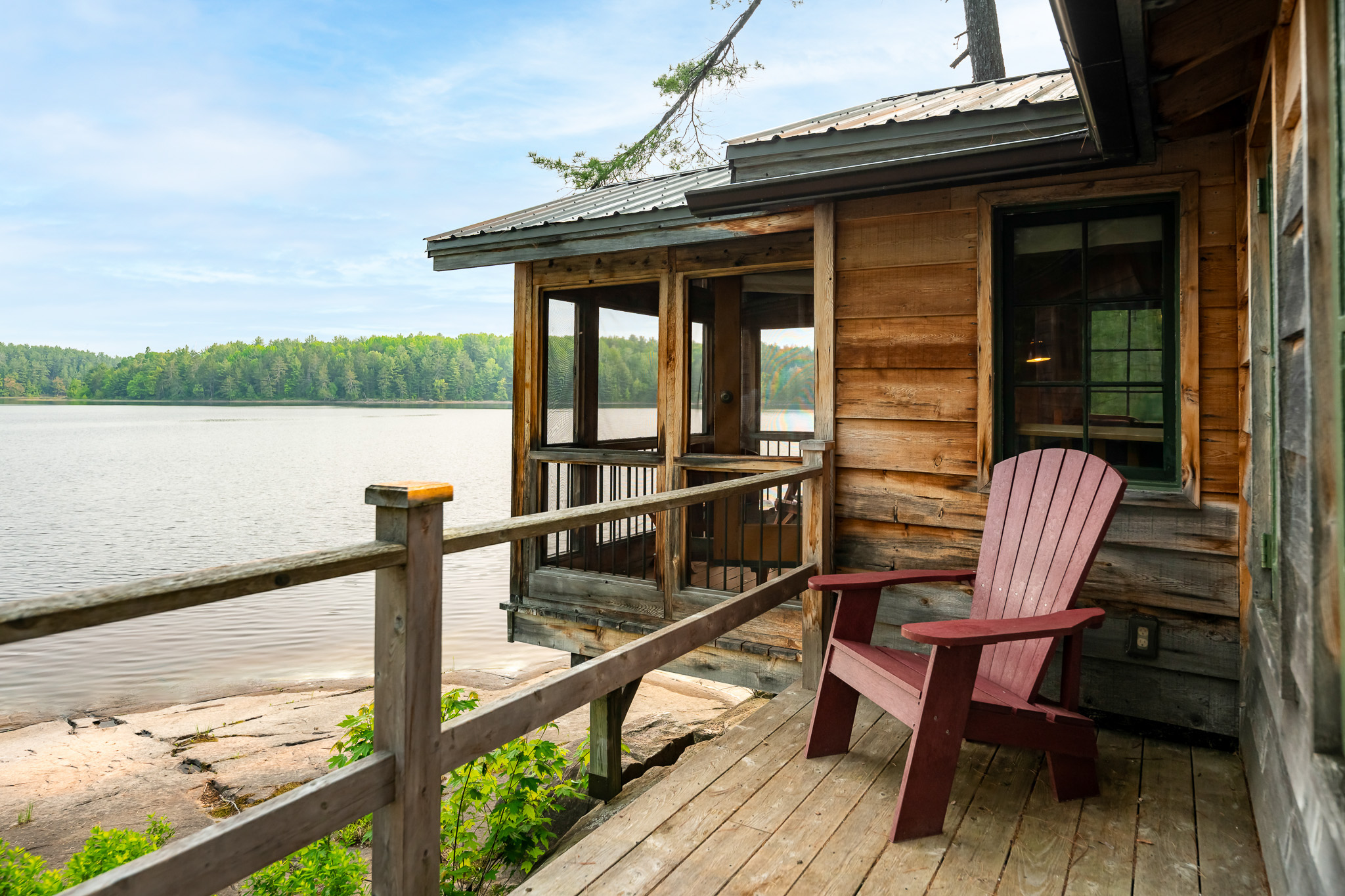 The screened porch hangs almost over the water and is a great place to relax. Views across the bay are lovely. The cottage has a kitchen and eating area, living room with French doors to the screened porch. A bedroom area with king bed that opens out into the living room & separate bedroom with a king bed (twins if you prefer). Pond is a comfortable & popular cottage.
