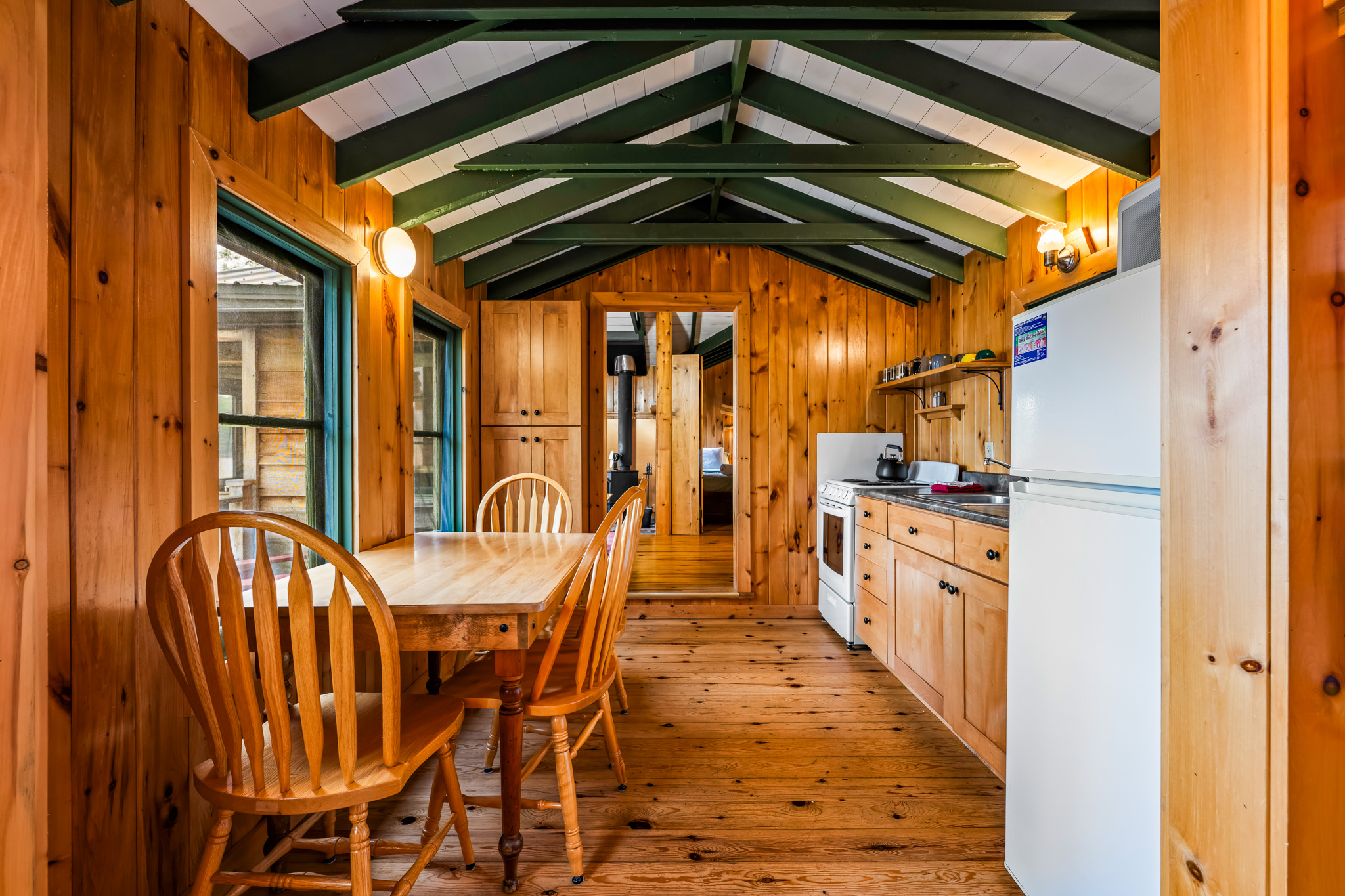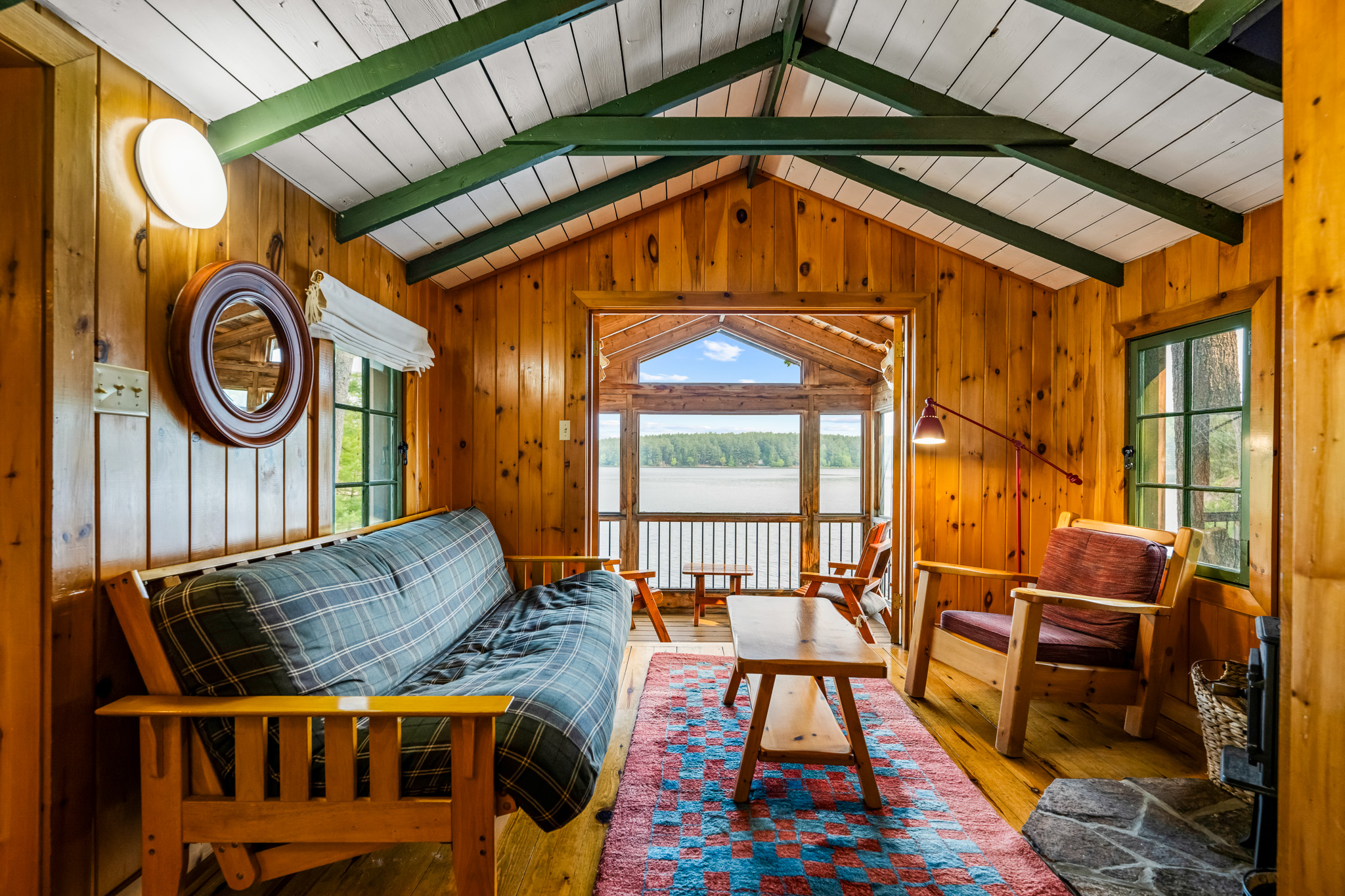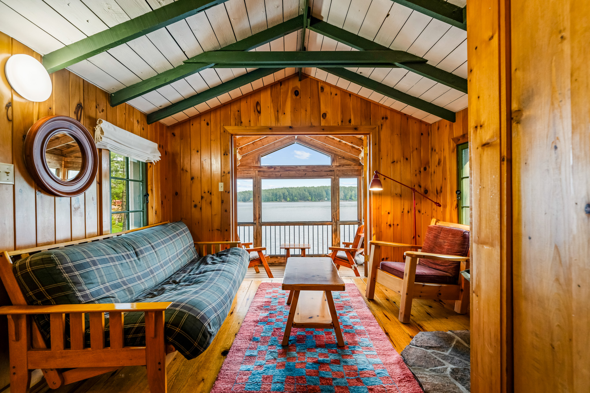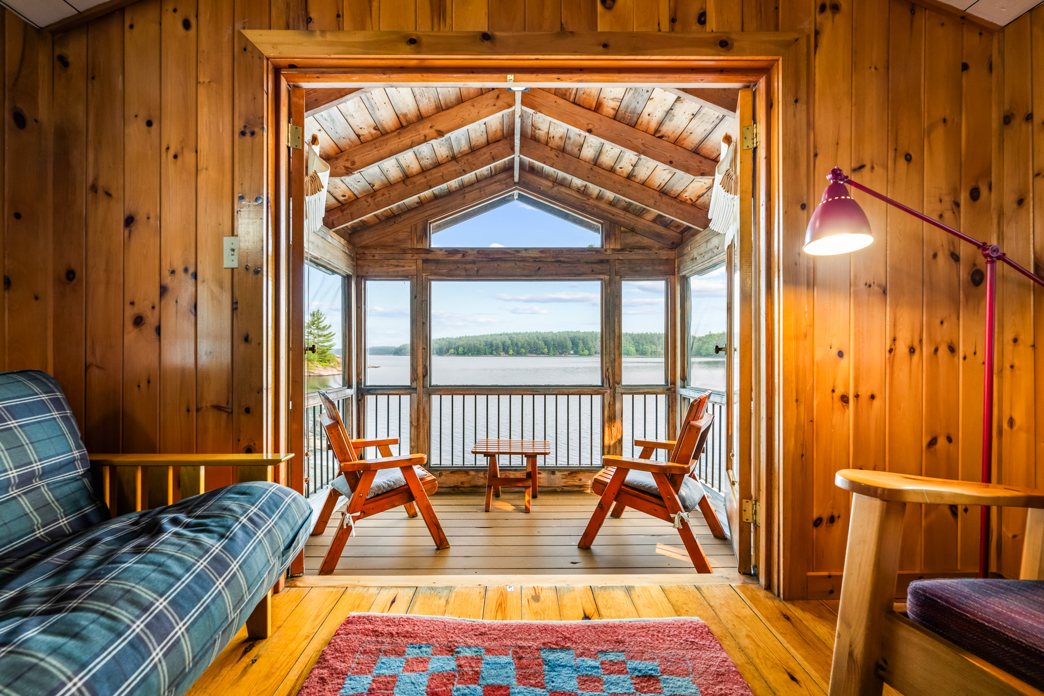 The screened porch hangs almost over the water and is a great place to relax. Views across the bay are lovely. The cottage has a kitchen and eating area, living room with French doors to the screened porch. A bedroom area with king bed that opens out into the living room & separate bedroom with a king bed (twins if you prefer). Pond is a comfortable & popular cottage.