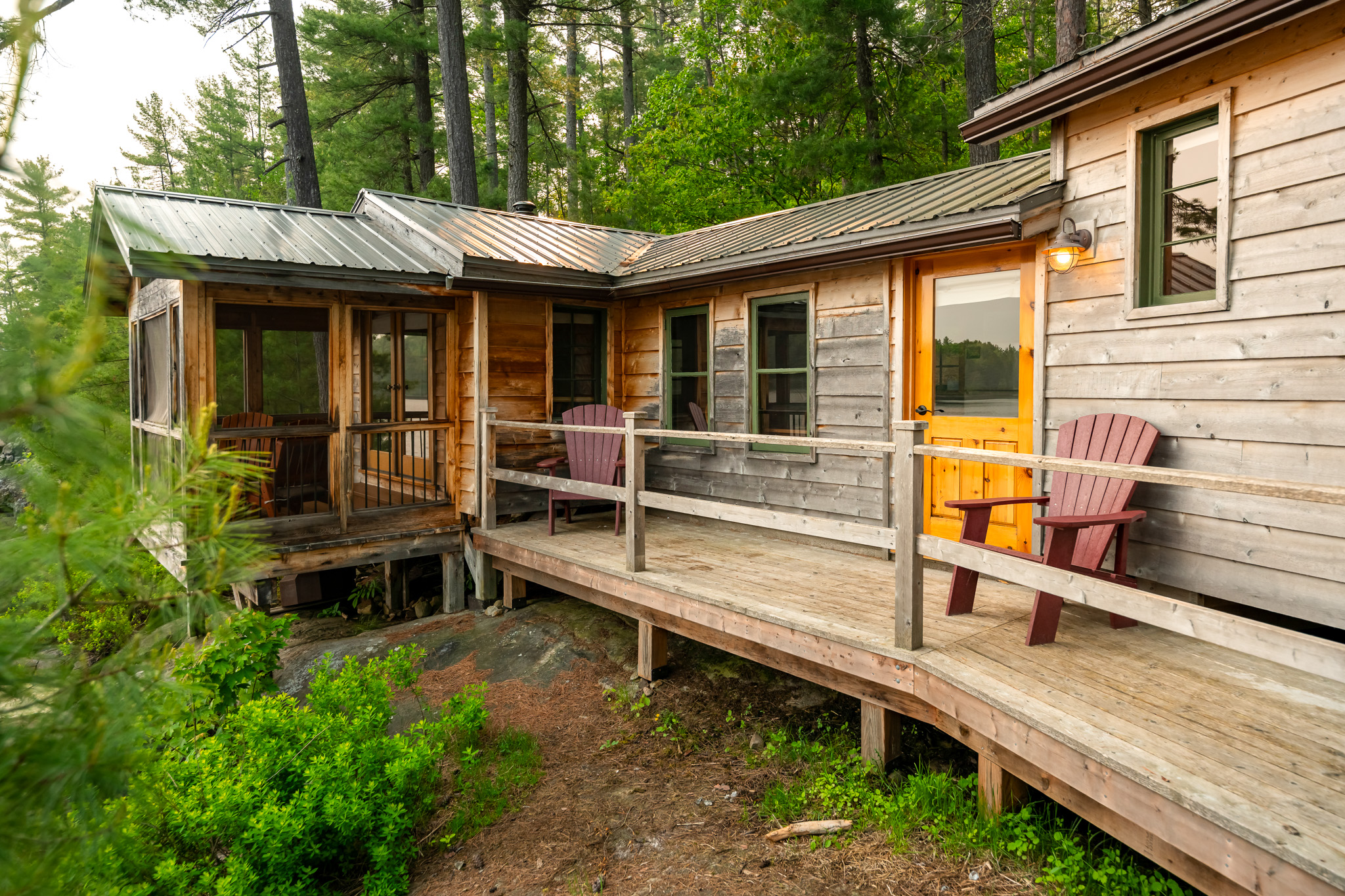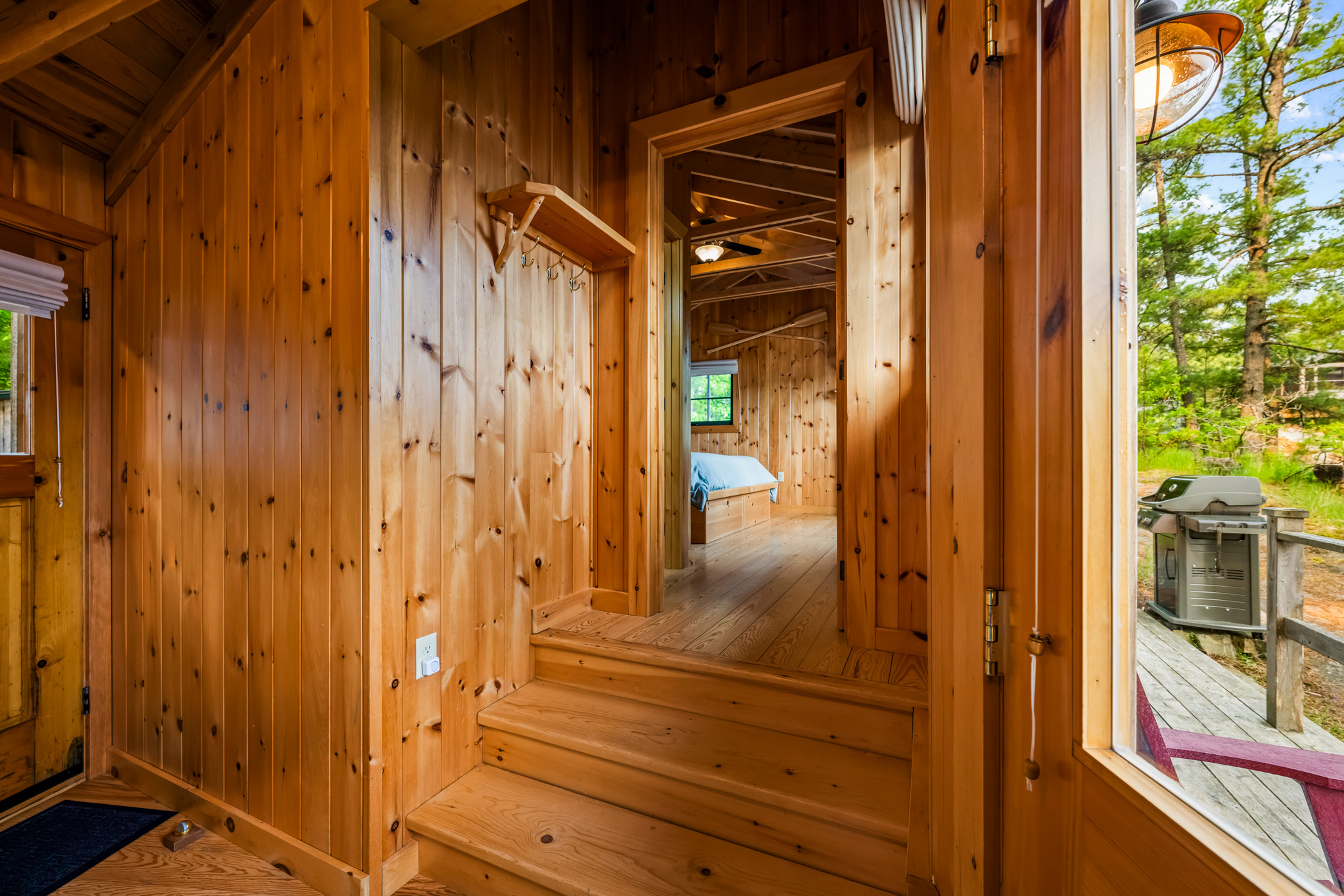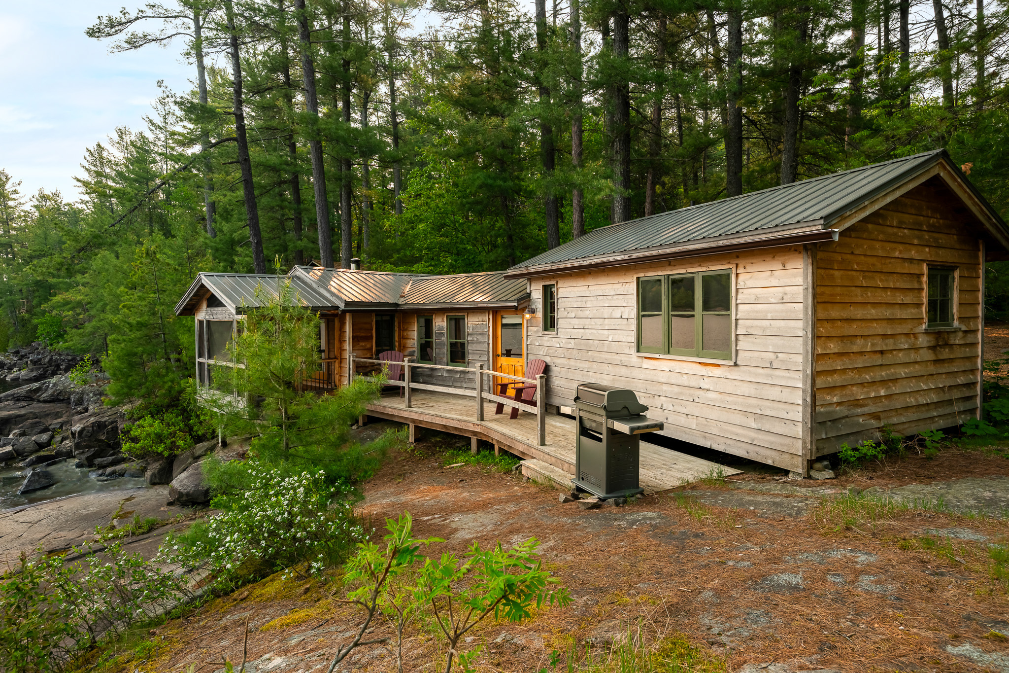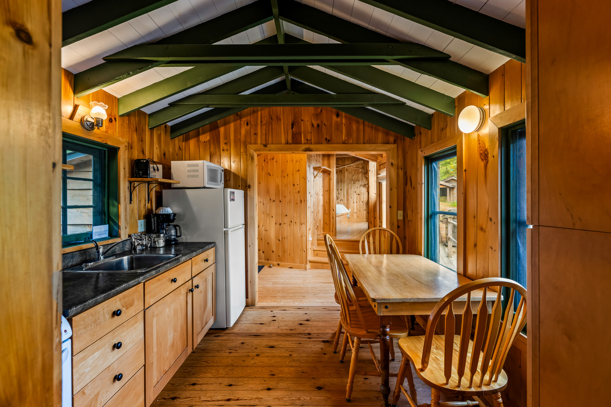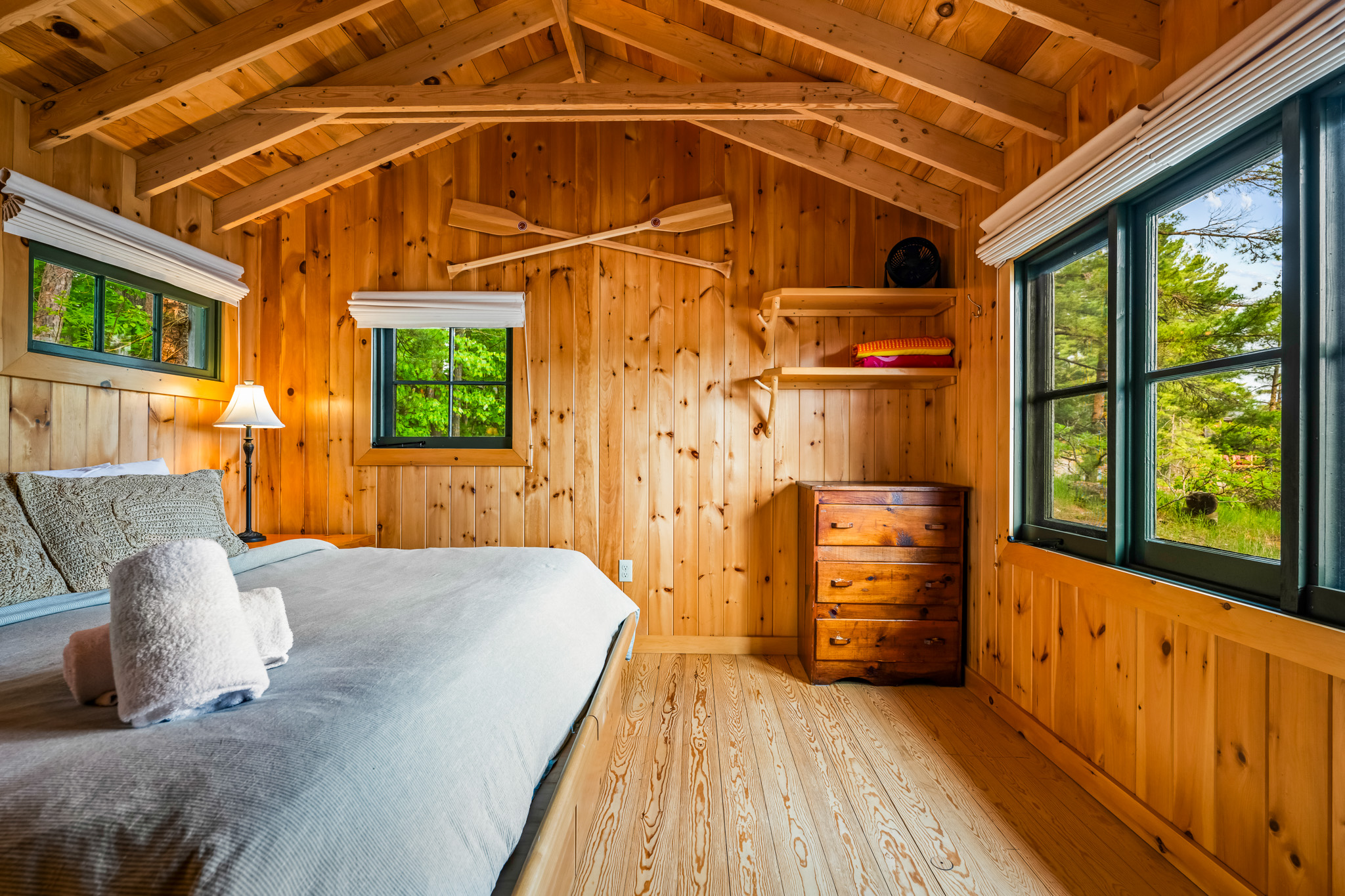 The screened porch hangs almost over the water and is a great place to relax. Views across the bay are lovely. The cottage has a kitchen and eating area, living room with French doors to the screened porch. A bedroom area with king bed that opens out into the living room & separate bedroom with a king bed (twins if you prefer). Pond is a comfortable & popular cottage.