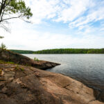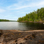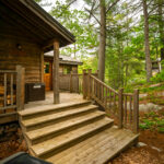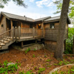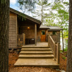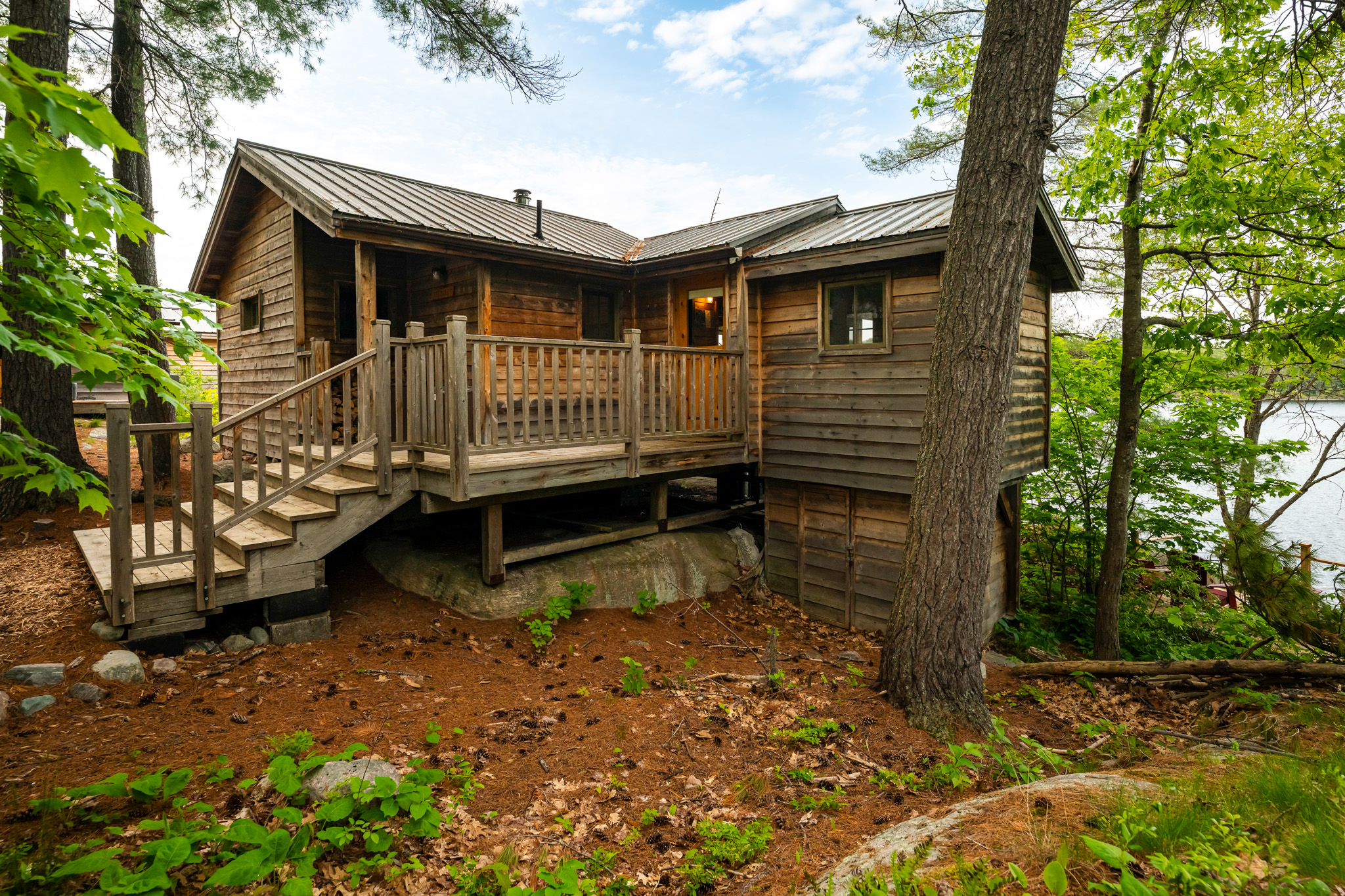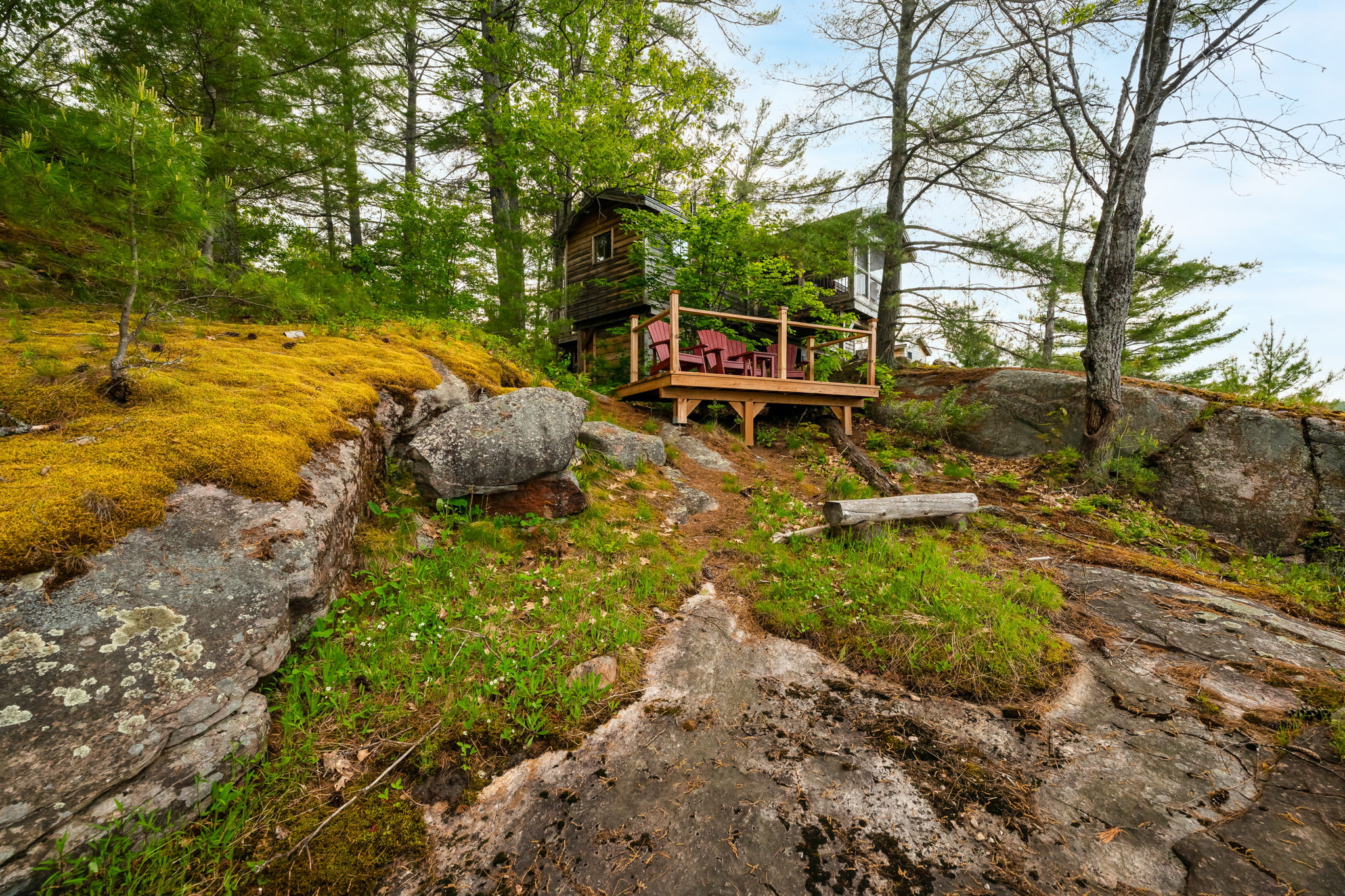 The cottage is surrounded by giant white pines. Swim just below the cottage.
