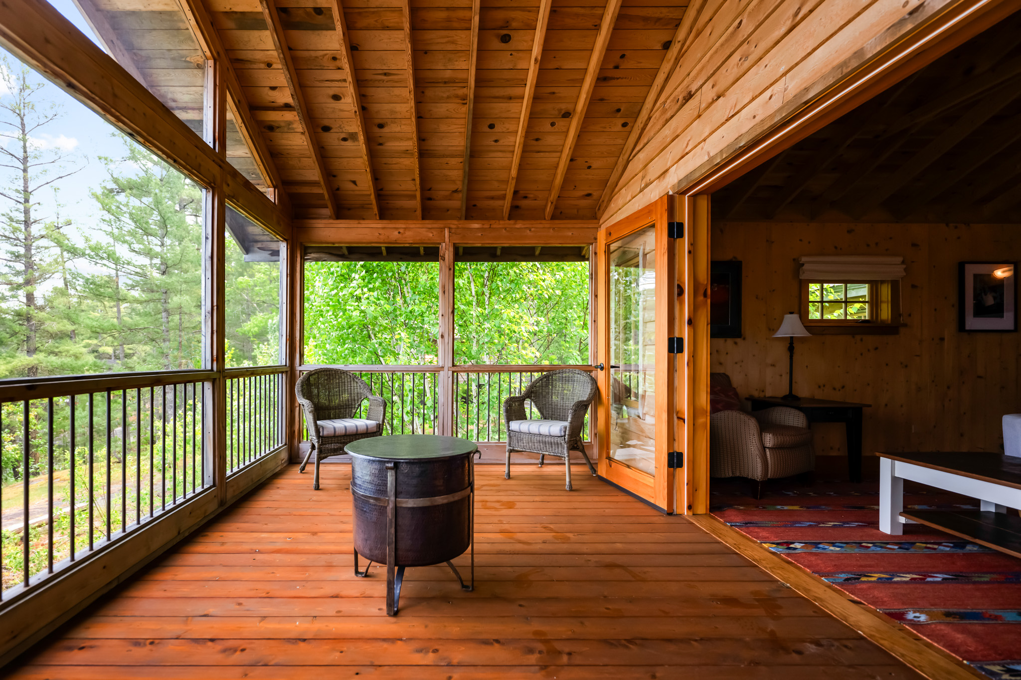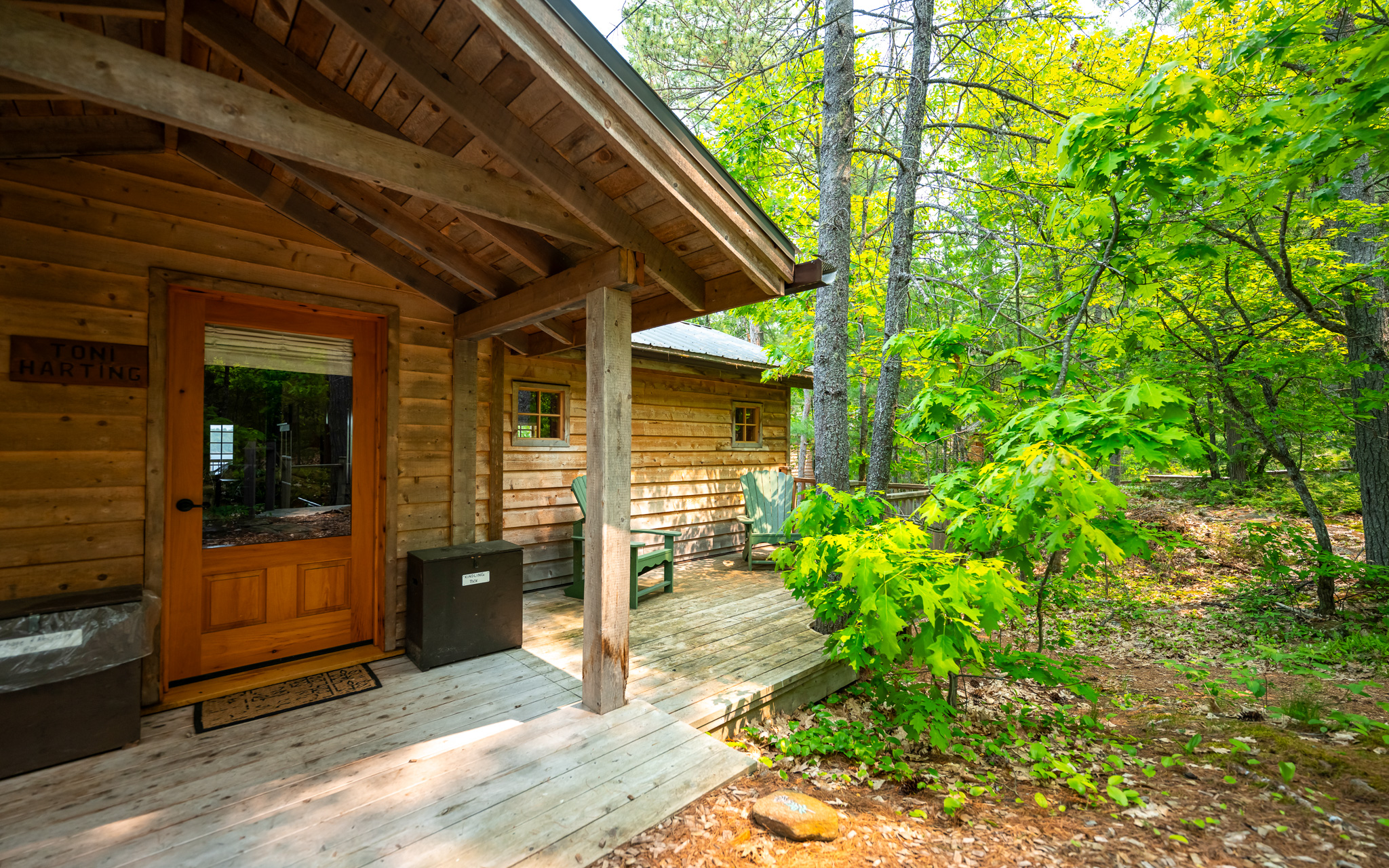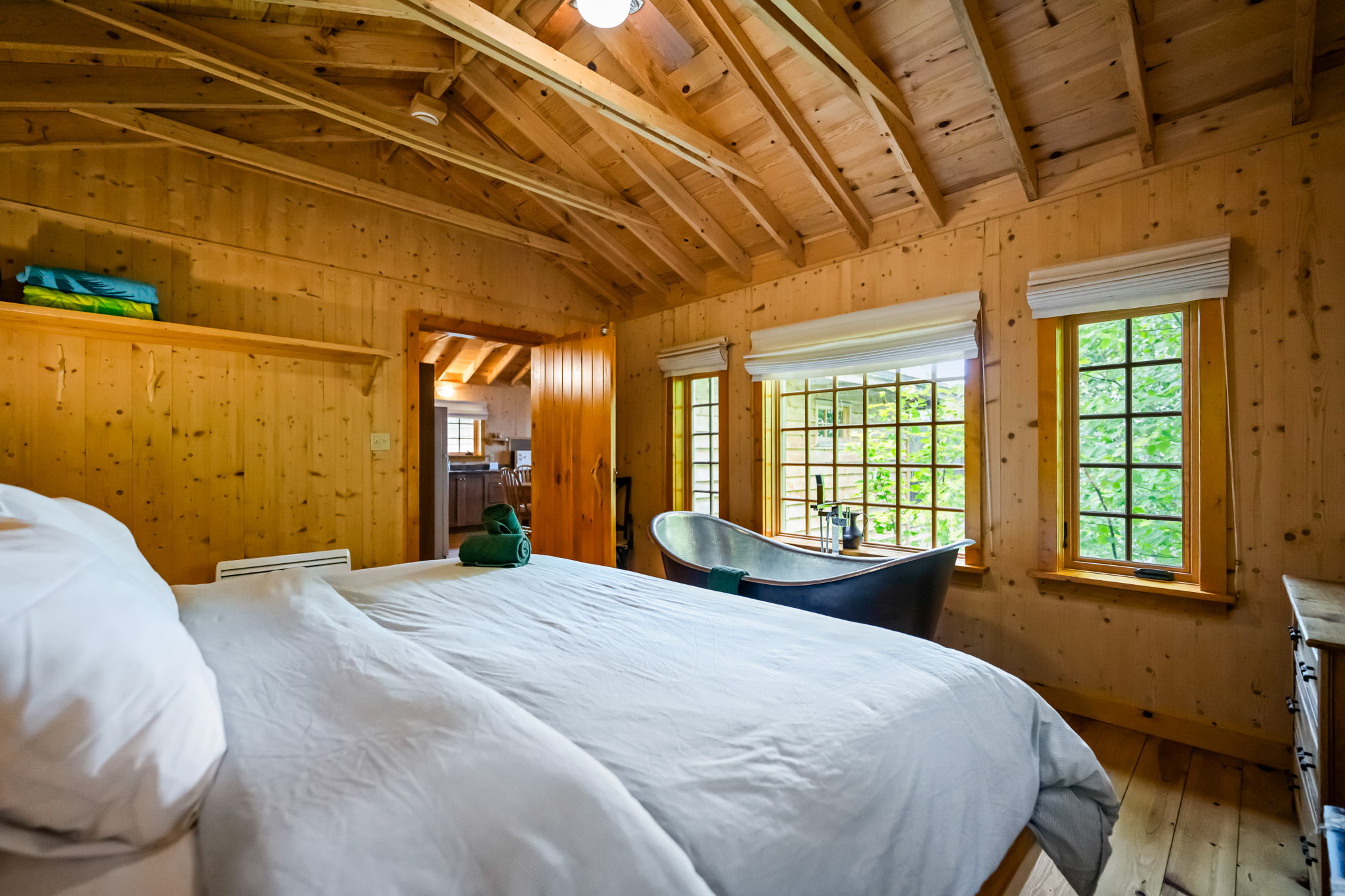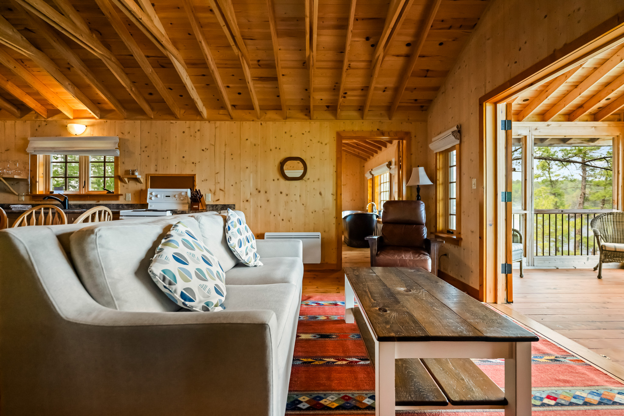 Harting is large inside with well designed space and cathedral ceilings. A kitchen and eating area are next to a generous living room which opens, through French doors, onto a beautiful cedar screened porch with a hammock. Two bedrooms open off the living space, each with king beds – twins if you prefer. There are lovely views of the water. Harting faces the sunrise and is close to our trail system.