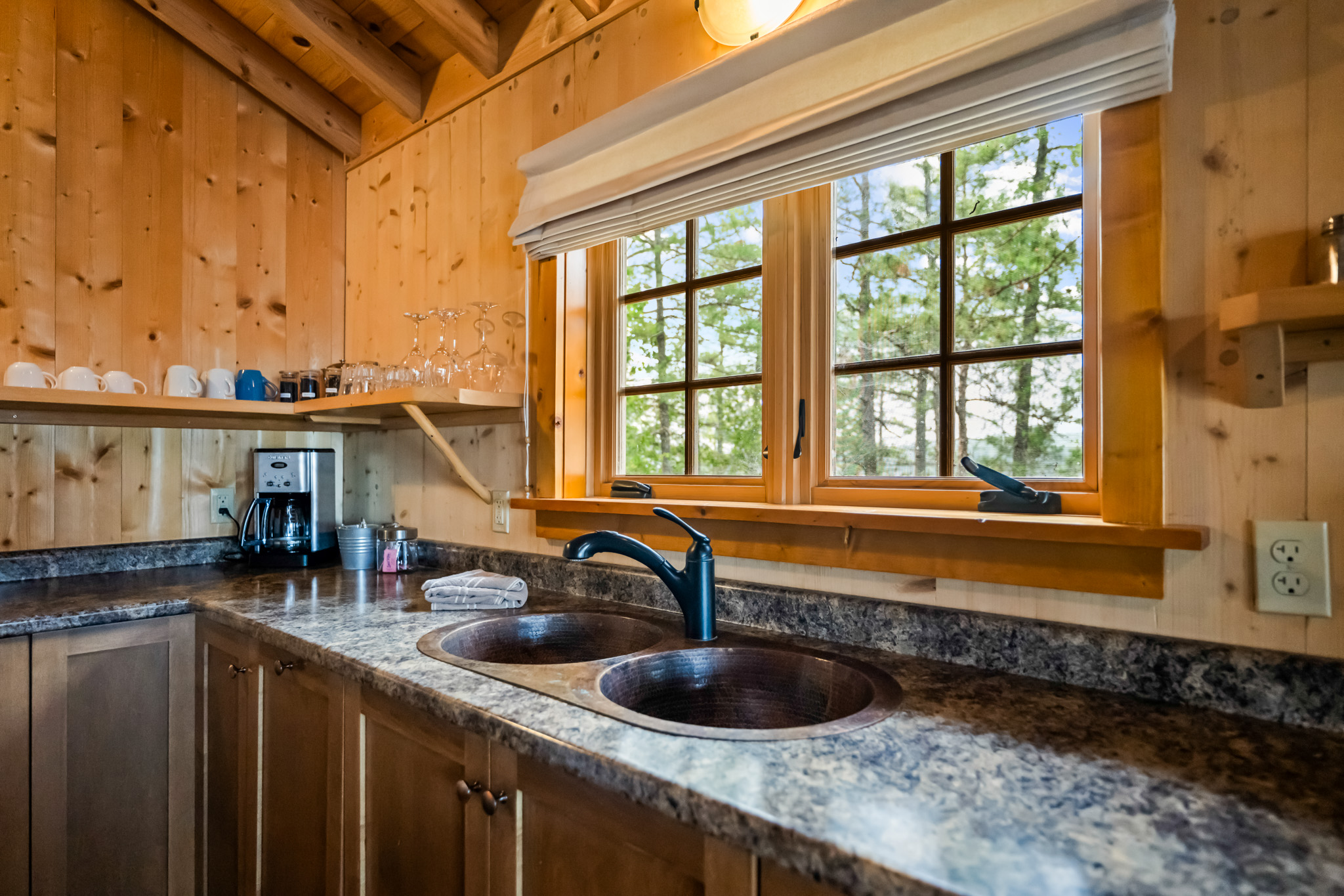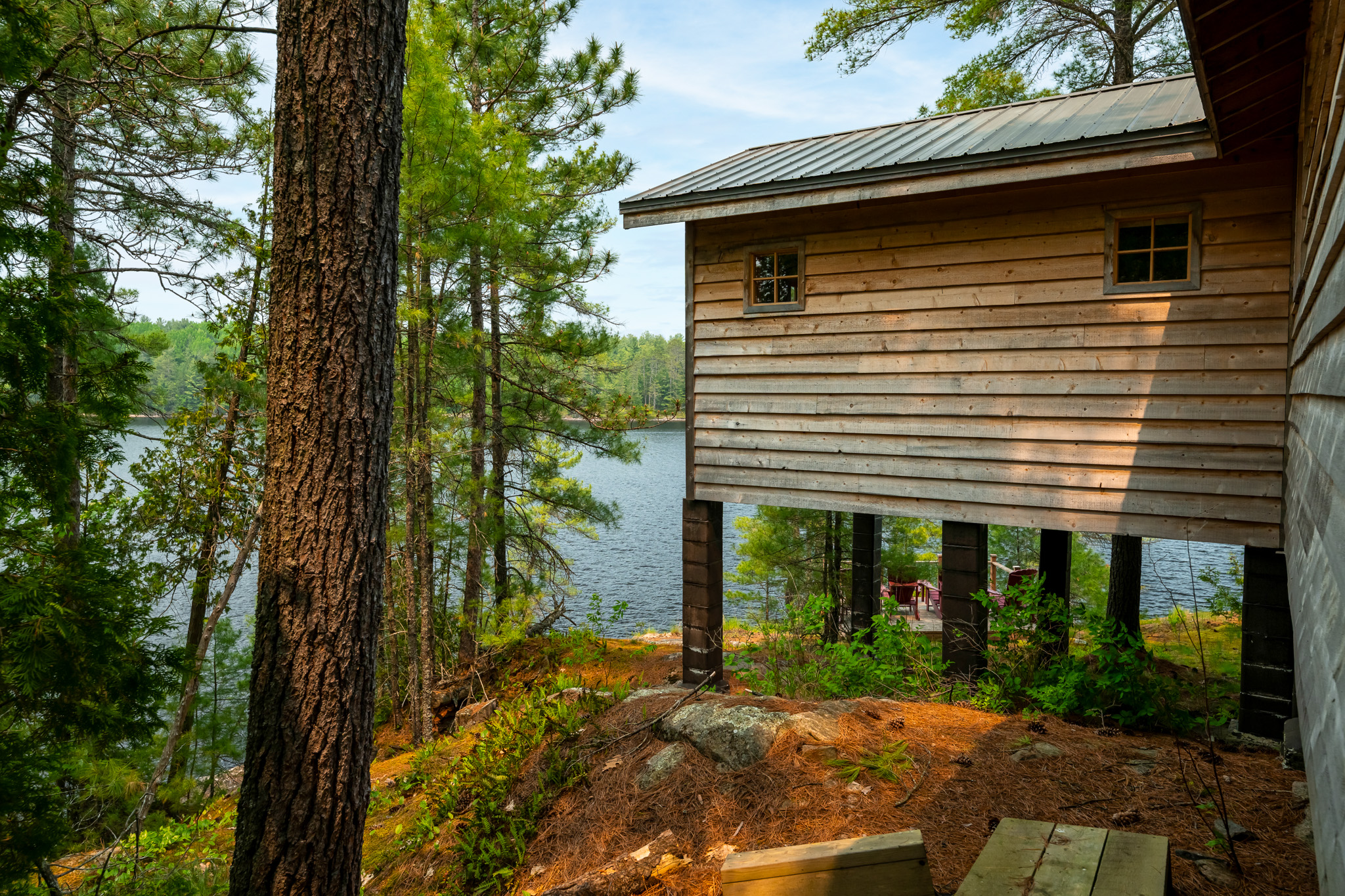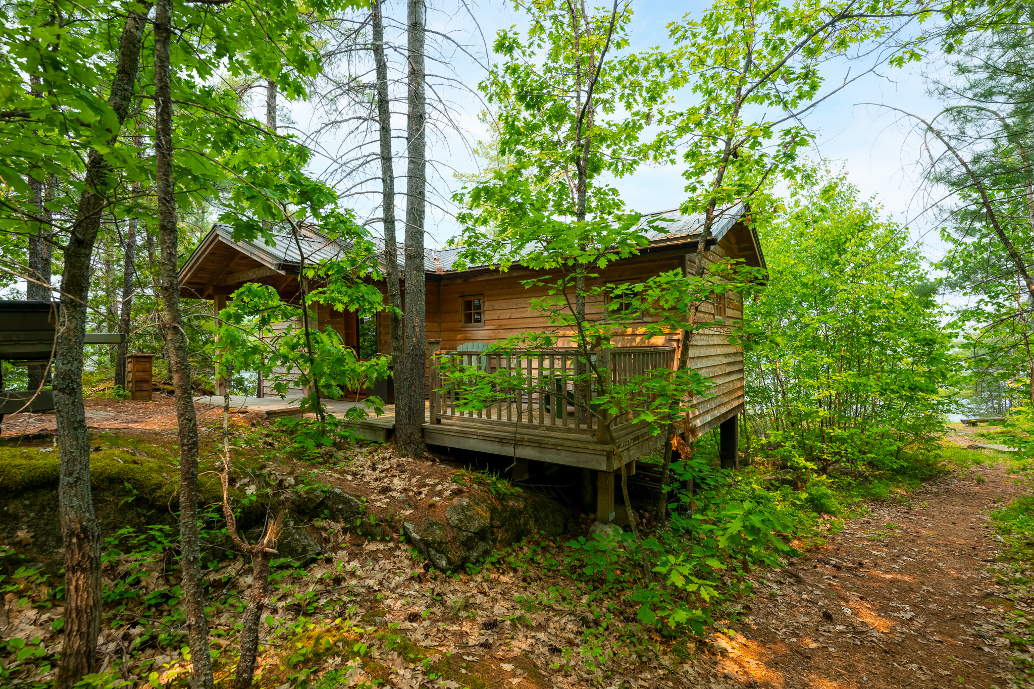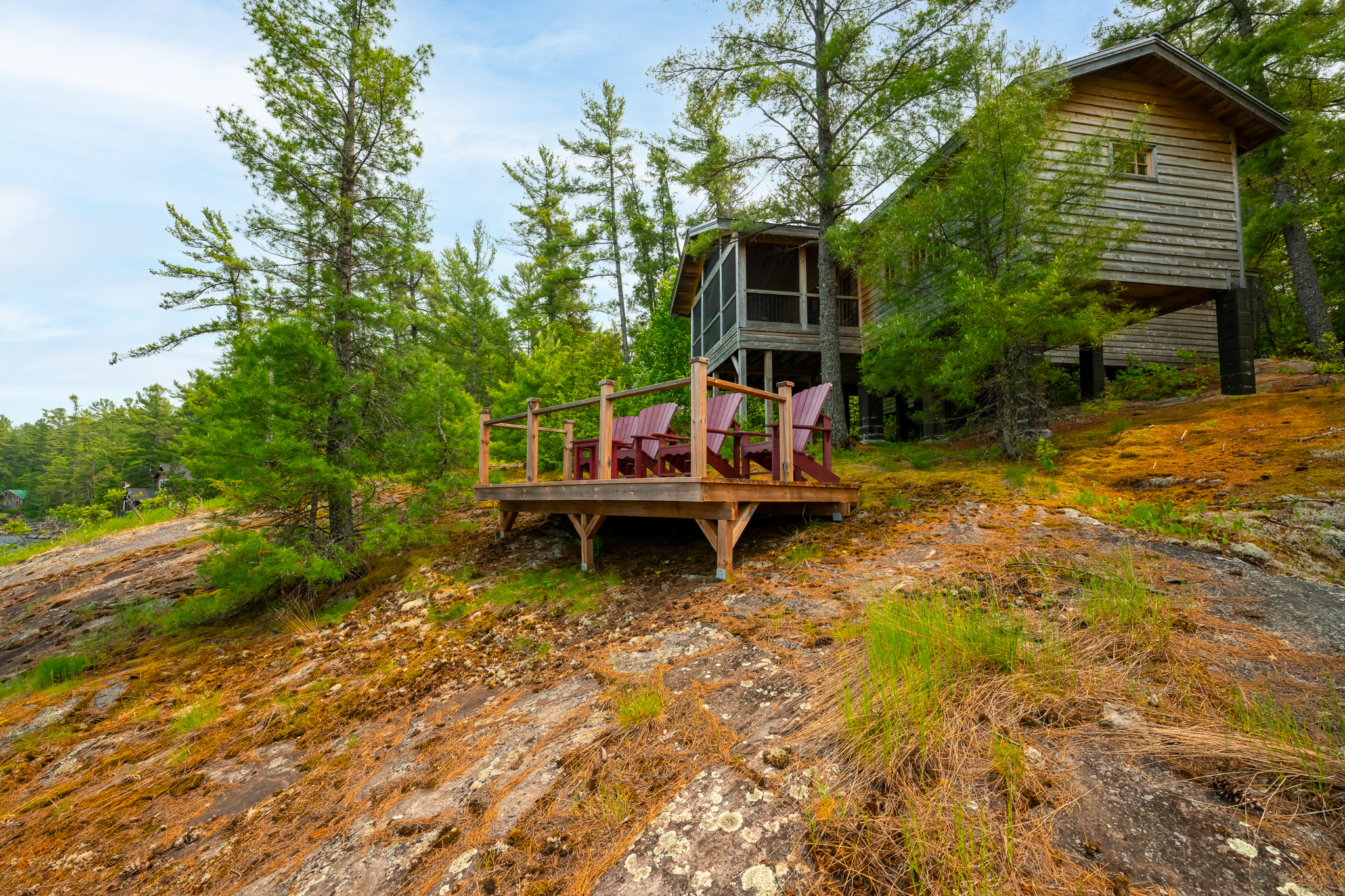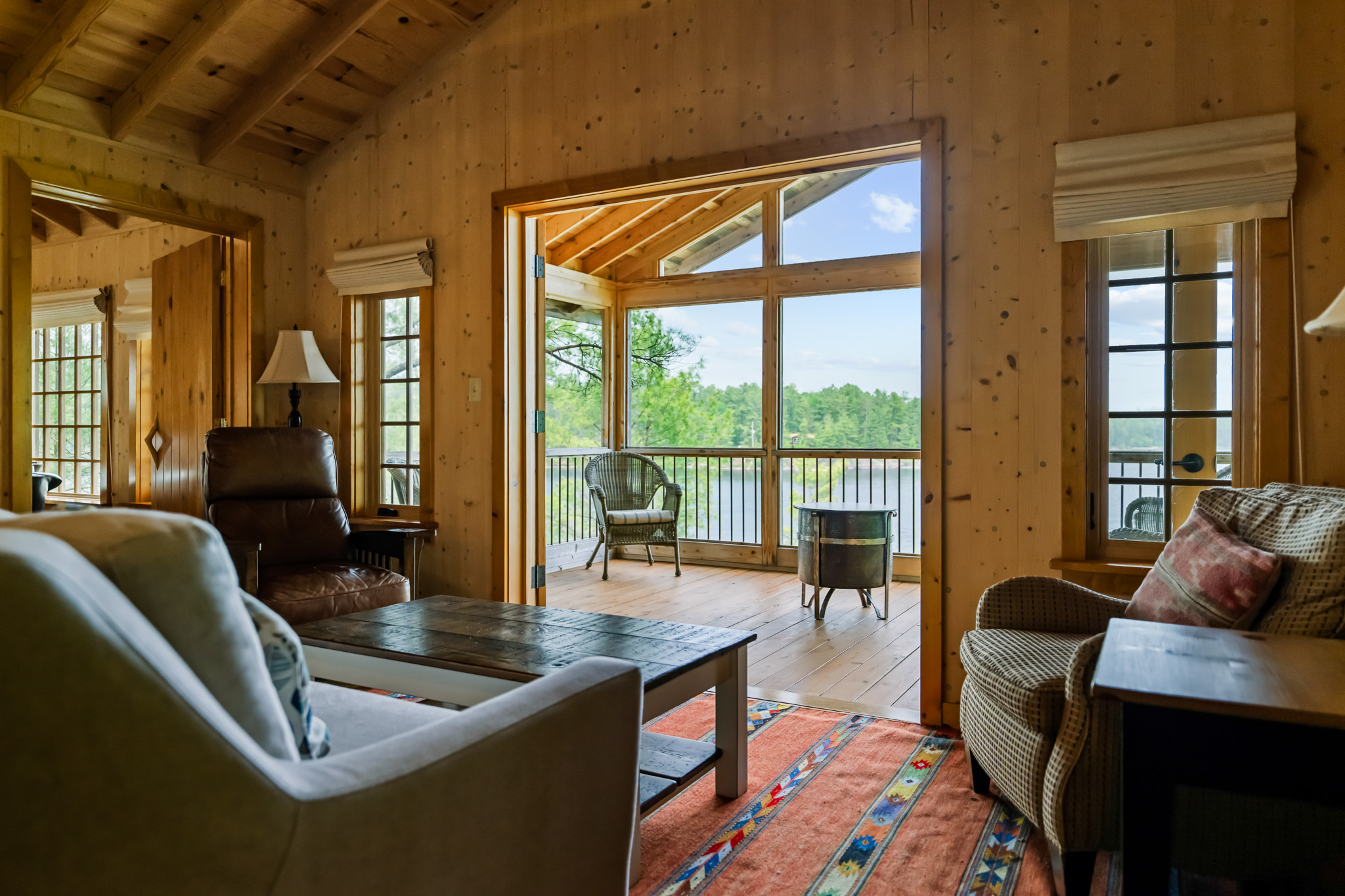 Harting is large inside with well designed space and cathedral ceilings. A kitchen and eating area are next to a generous living room which opens, through French doors, onto a beautiful cedar screened porch with a hammock. Two bedrooms open off the living space, each with king beds – twins if you prefer. There are lovely views of the water. Harting faces the sunrise and is close to our trail system.