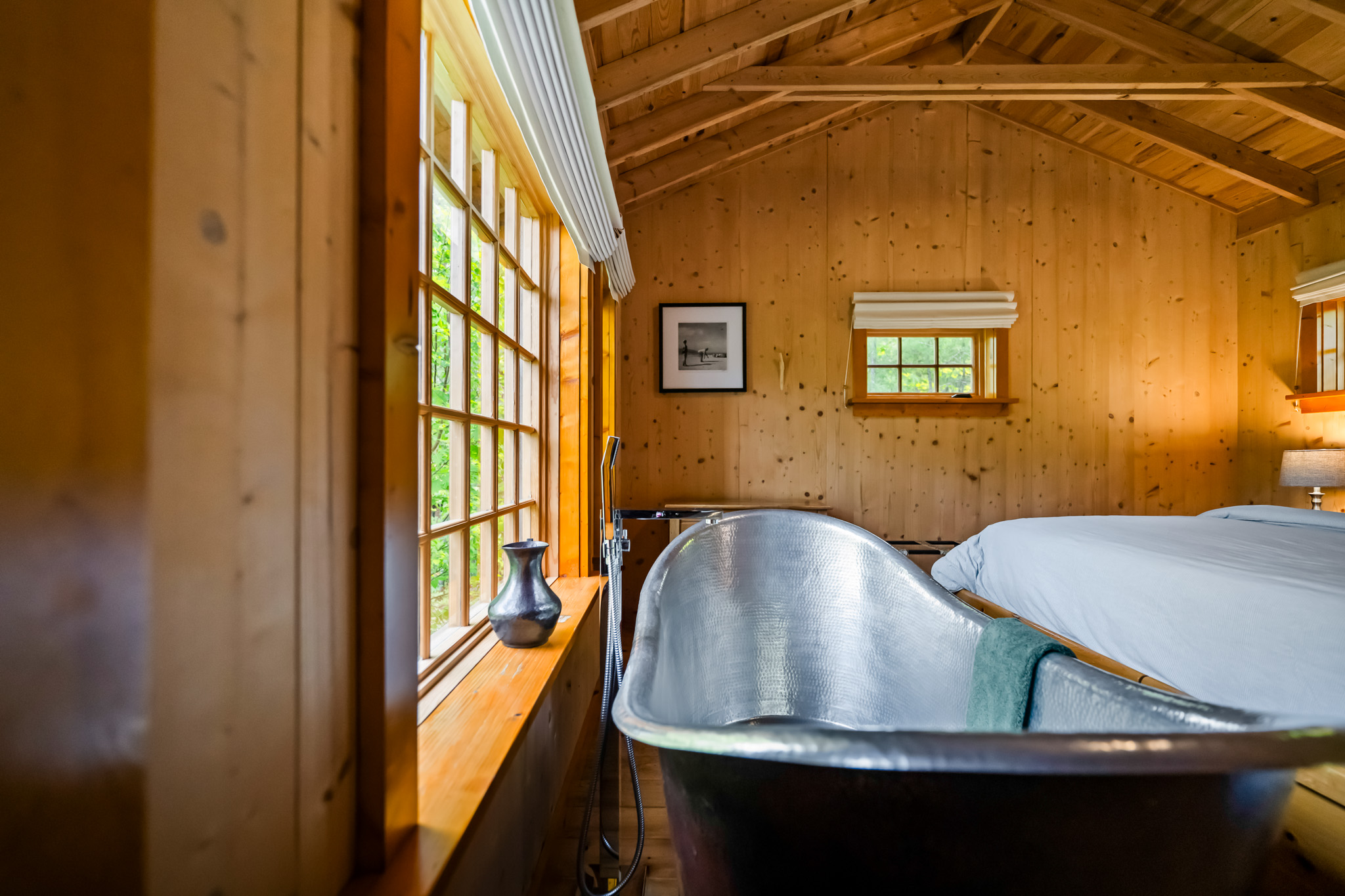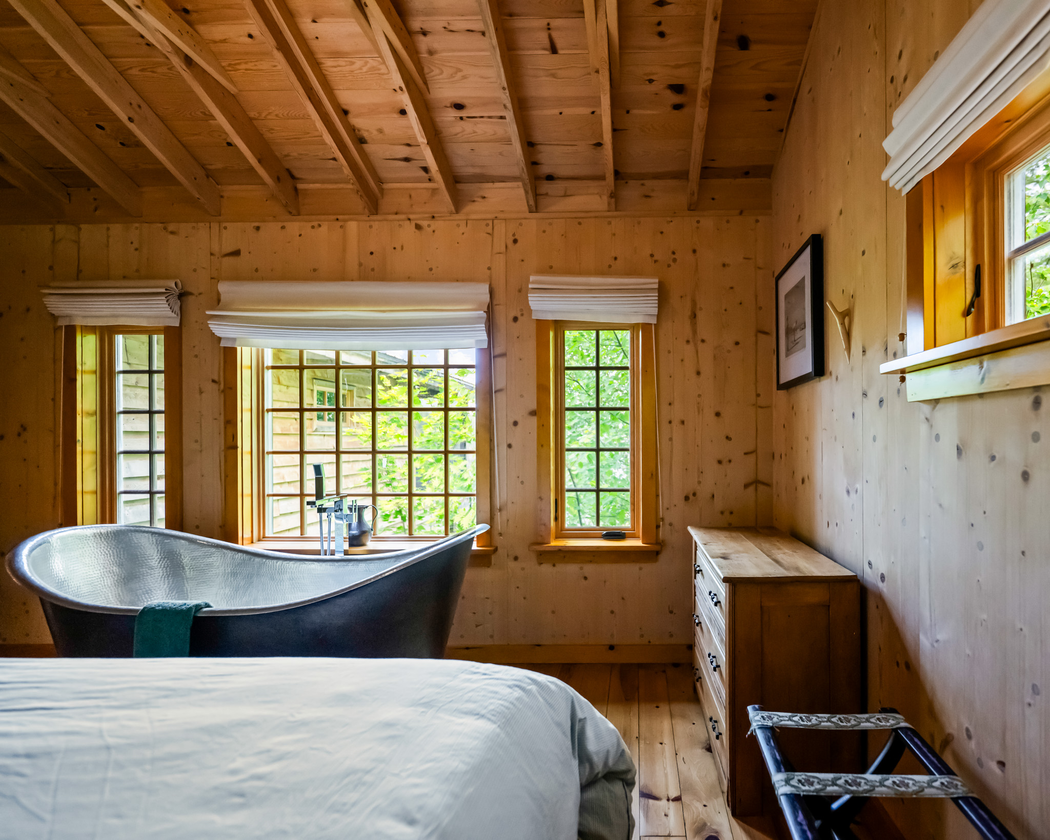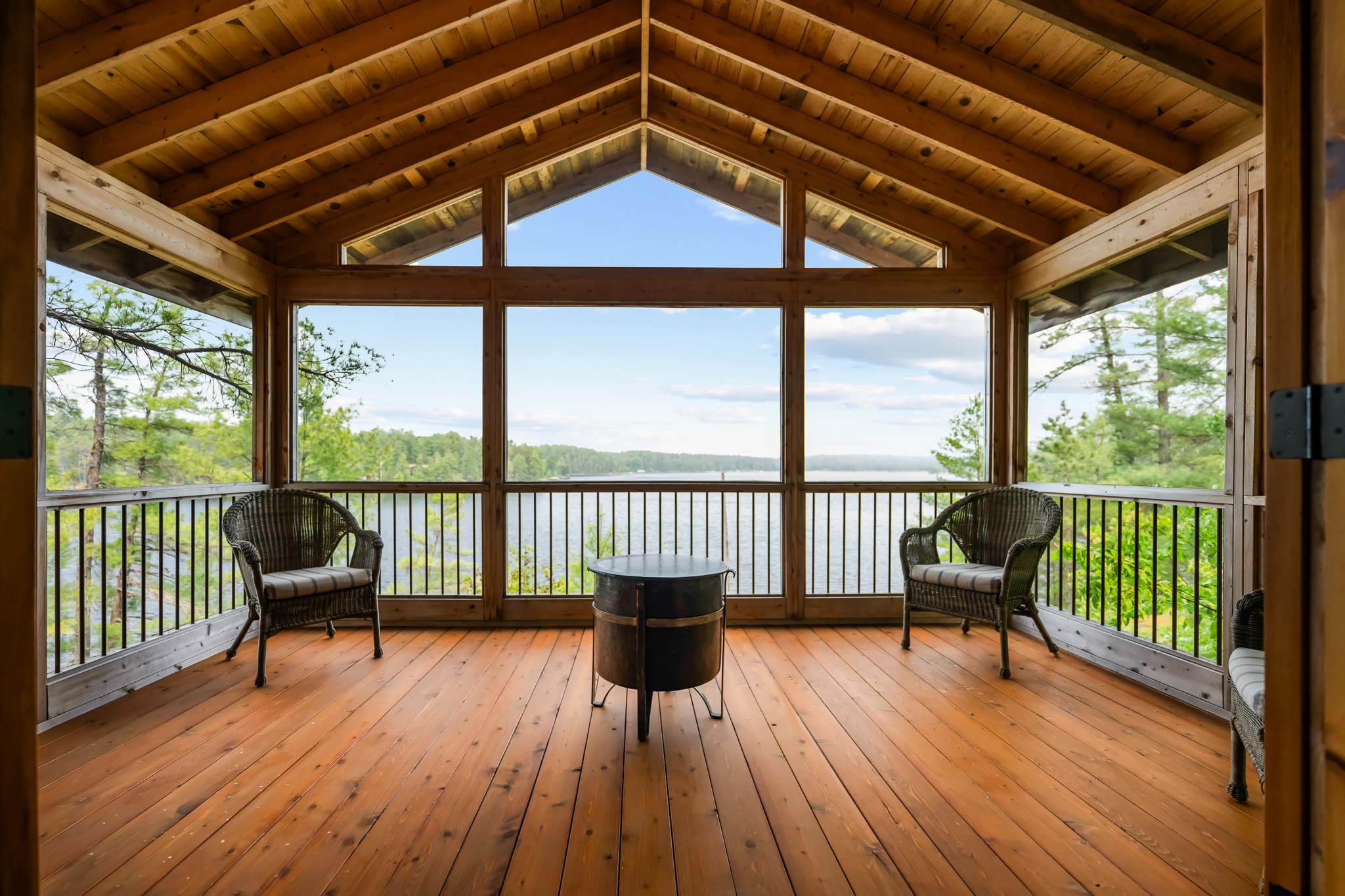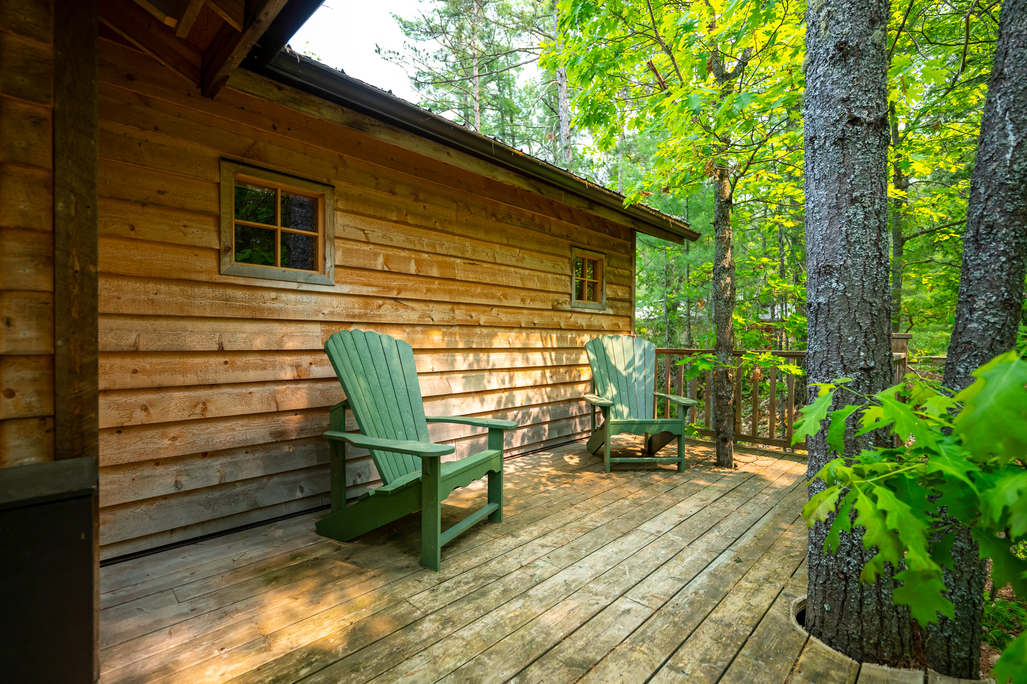Harting is large inside with well designed space and cathedral ceilings. A kitchen and eating area are next to a generous living room which opens, through French doors, onto a beautiful cedar screened porch with a hammock. Two bedrooms open off the living space, each with king beds – twins if you prefer. There are lovely views of the water. Harting faces the sunrise and is close to our trail system.