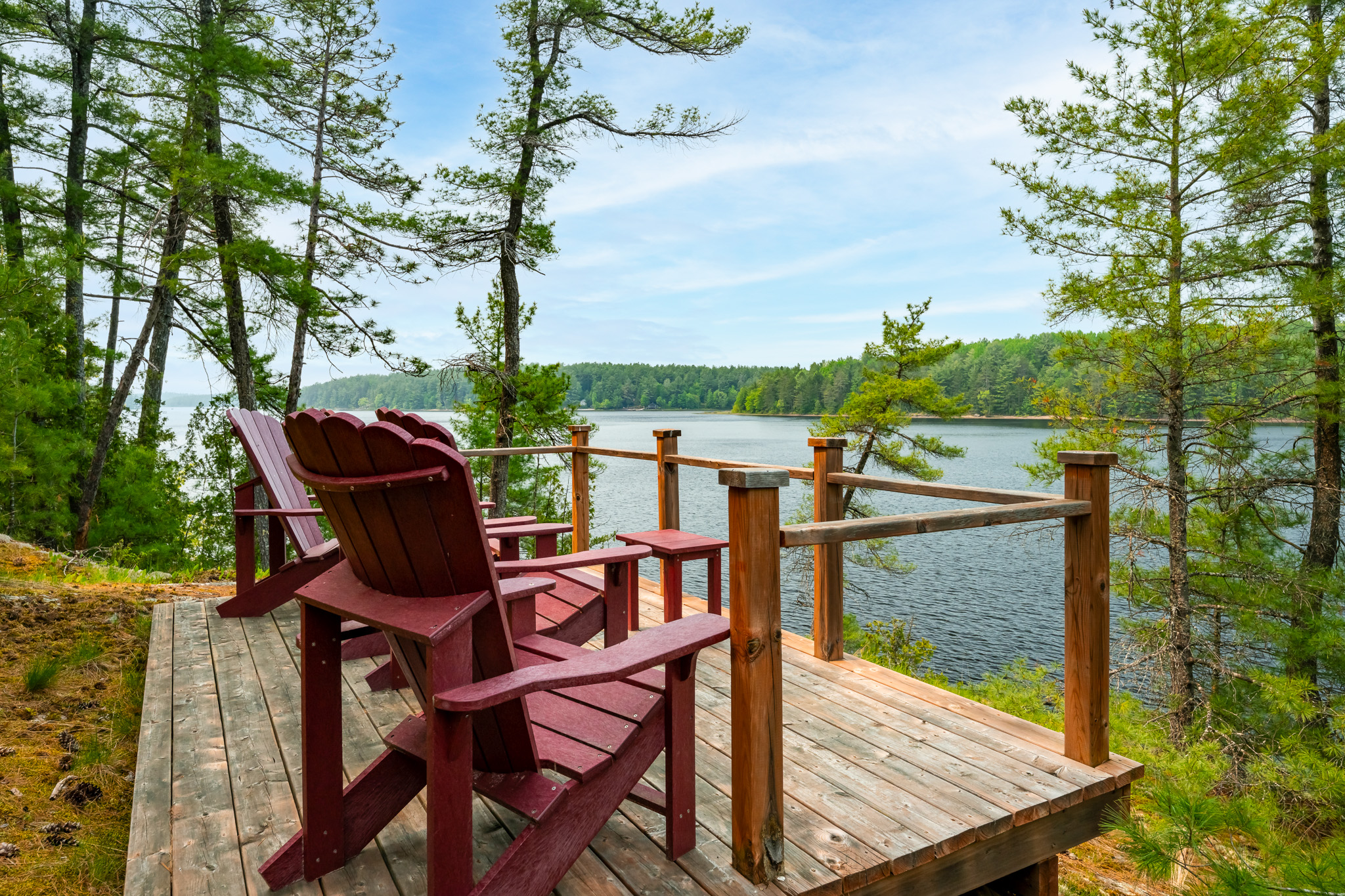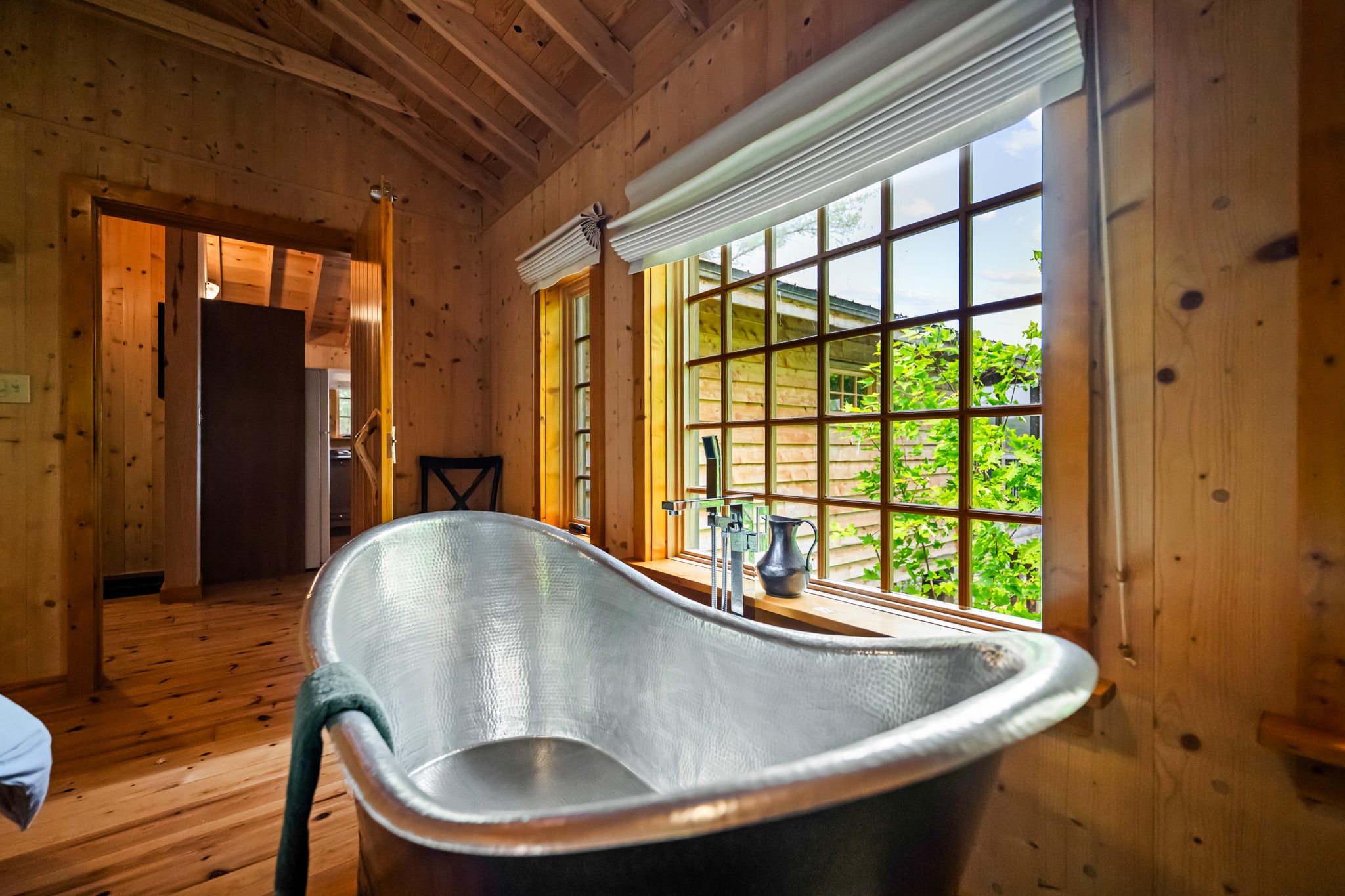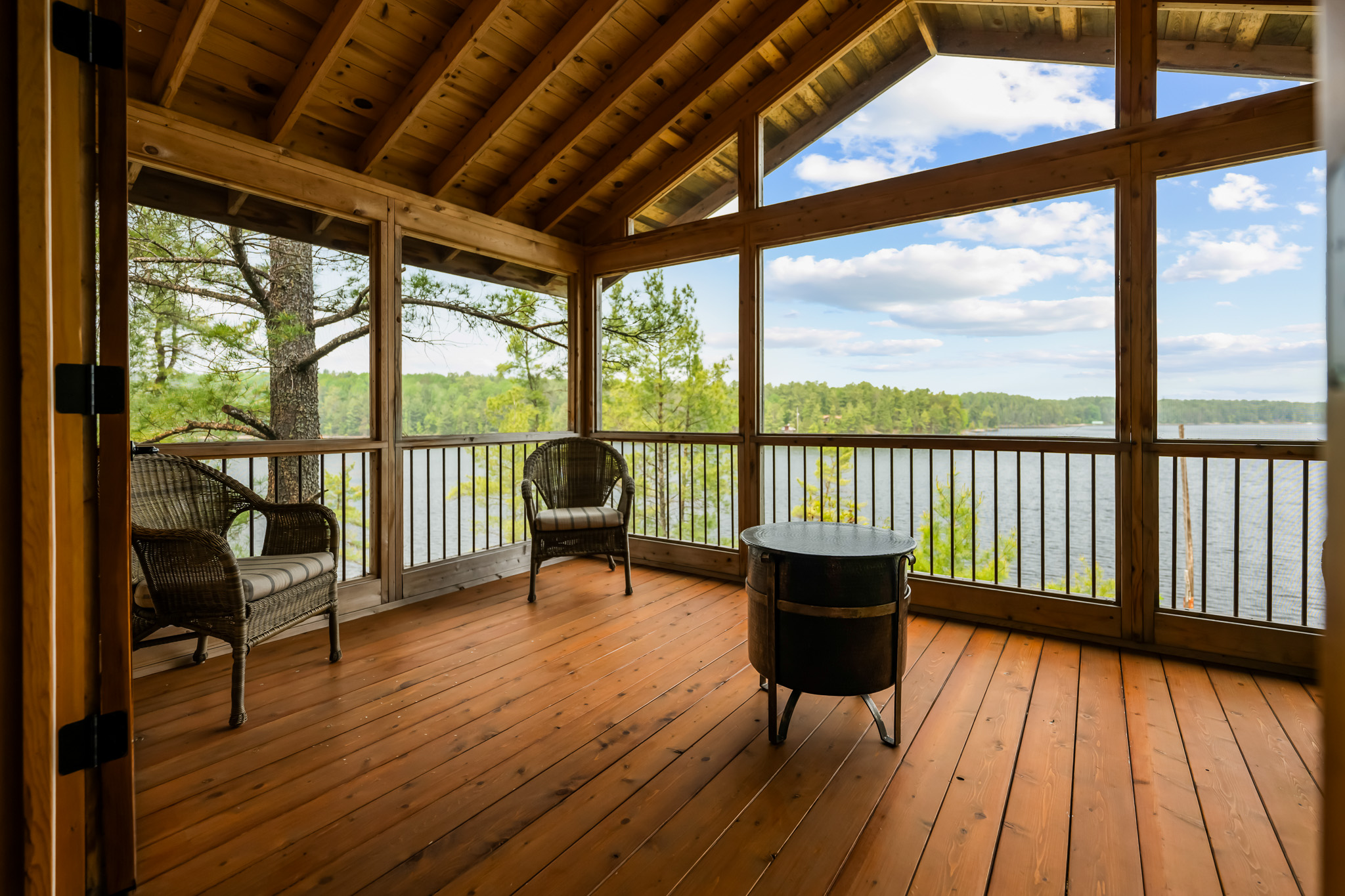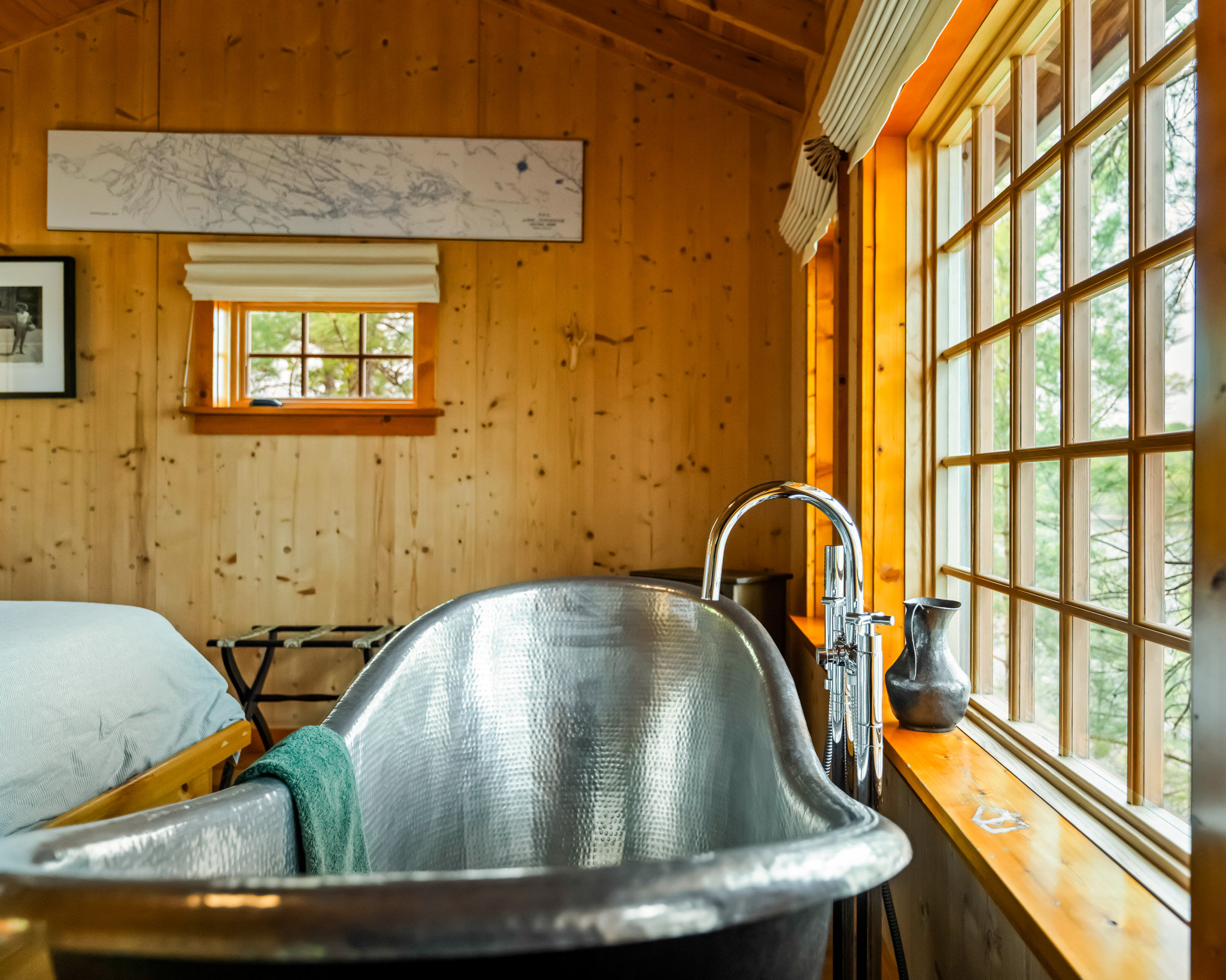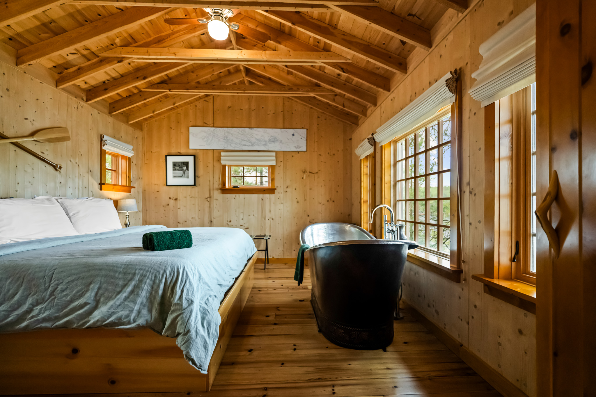 Harting is large inside with well designed space and cathedral ceilings. A kitchen and eating area are next to a generous living room which opens, through French doors, onto a beautiful cedar screened porch with a hammock. Two bedrooms open off the living space, each with king beds – twins if you prefer. There are lovely views of the water. Harting faces the sunrise and is close to our trail system.